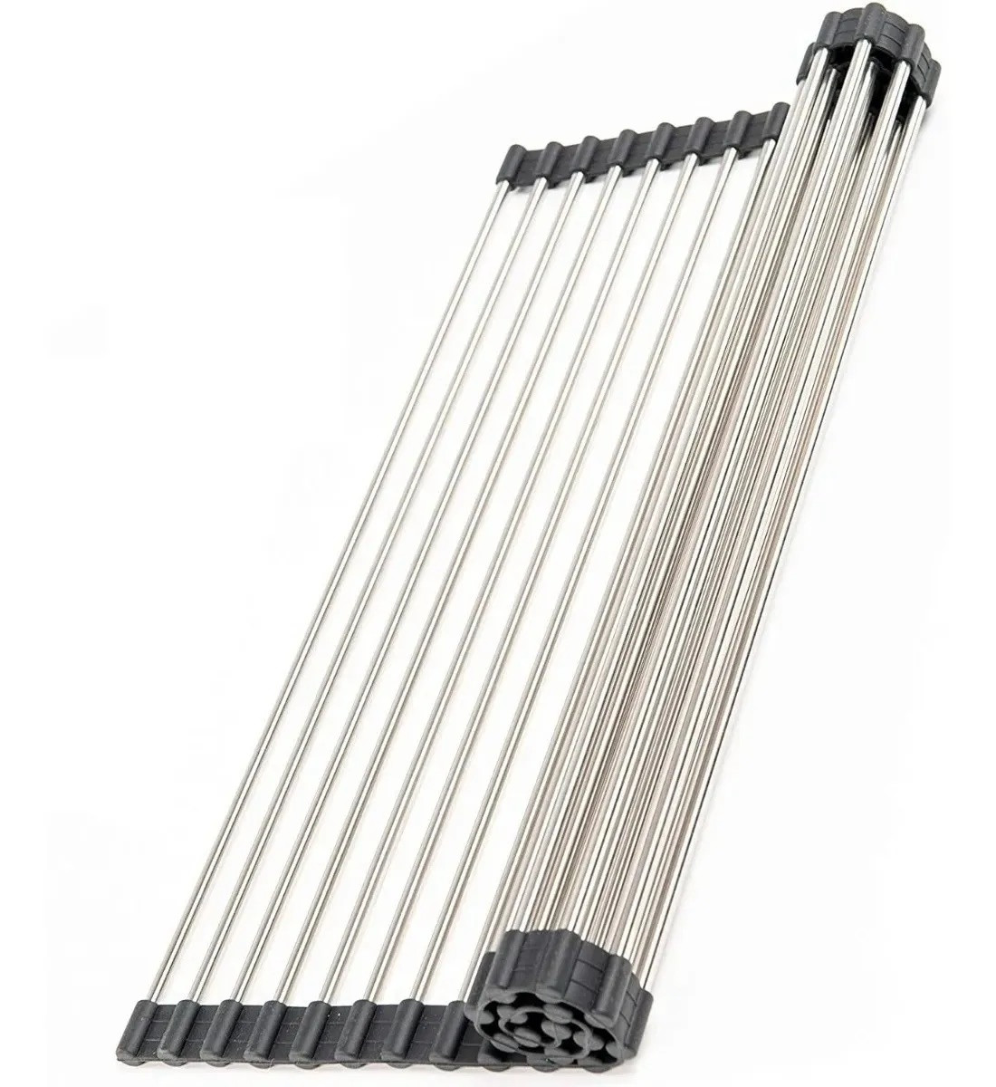 El escurridor de cocina enrollable está diseñado con 15 tubos de acero inoxidable, fijados firmemente por silicona, lo que hace que sea fácil de usar, colocar, limpiar o enrollar para guardar en el armario cuando no esté en uso, ahorrando espacio en la encimera.