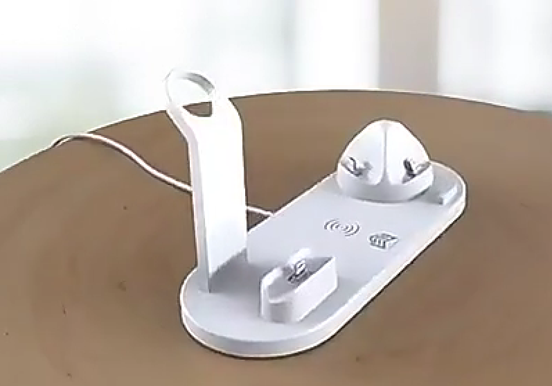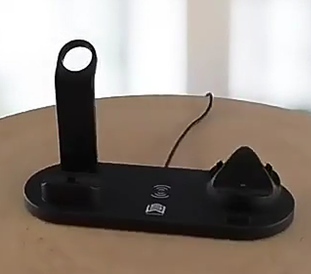 Tiene 3 puntos de carga y el soporte para poner el iWatch (para lo cual debe colocarse el cargador del reloj, y conectarlo en la parte posterior de la estación de carga – en la entrada USB)
