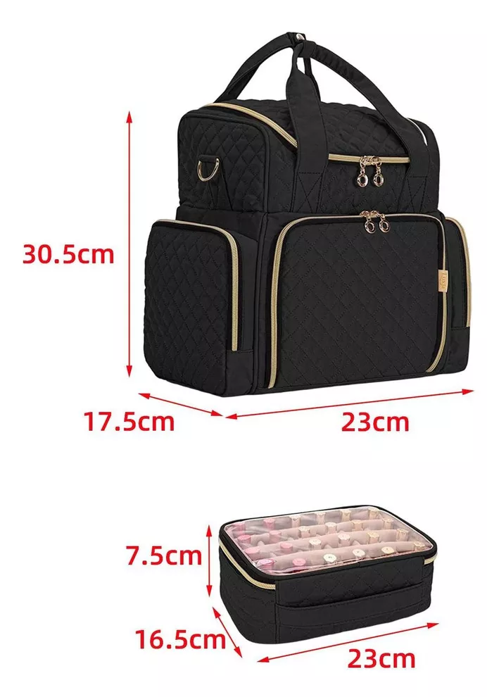 [Material premium]: el estuche organizador de uñas está hecho de microfibra de poliéster suave. El interior acolchado suave mantiene su botella de esmalte de uñas en buenas condiciones. Dimensiones: 30,5 cm x 17,5 cm x 23 cm/12,01 pulgadas x 6,89 pulgadas x 9,06 pulgadas.