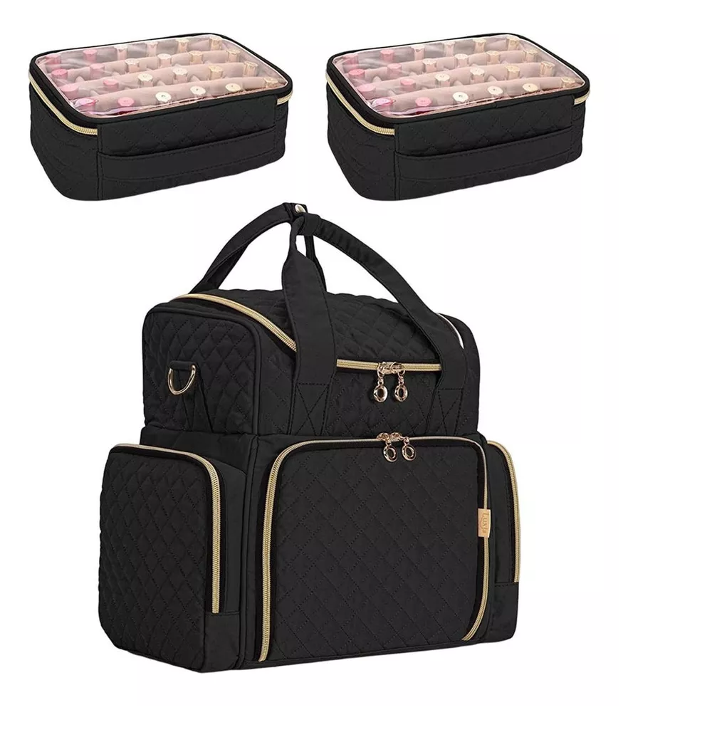 [Almacenamiento inferior]: necessary organizador de bolsas de maquillaje de viaje, el compartimento inferior contiene 2 cajas extraíbles. Cada caja tiene capacidad para 24 botellas de 15 ml (0,5 fl) de esmalte de uñas. El divisor de botellas en la funda de la botella es flexible y extraíble.