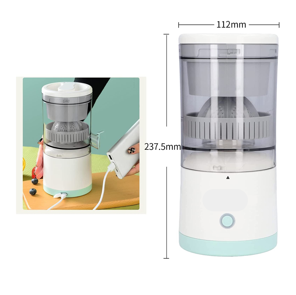 Utiliza el exprimidor después de cargarse completamente, no utilices el exprimidor cuando se carga, es muy adecuado para exprimir naranjas, limones, uvas, manzanas, peras, sandías, kiwi, granadas y otras frutas con suficiente jugo que se puede exprimir fácilmente, pero no verduras: pepinos, apio, zanahorias, etc. No se puede apretar, lo que causará daños a la máquina.