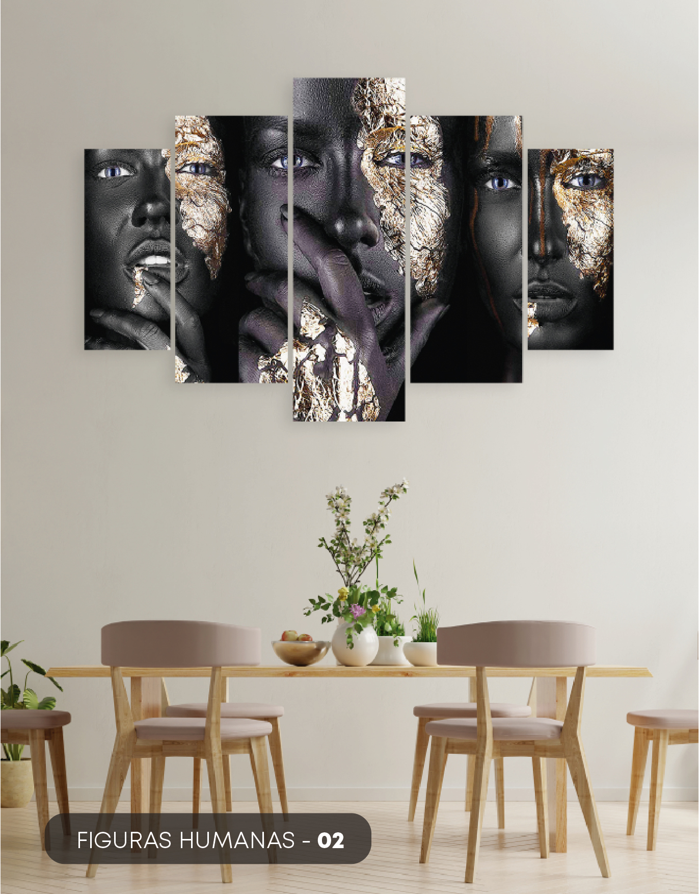 Cuadro compuesto por 5 retablos con una medida total de 114 cm de ancho y 75cm de alto (o viceversa, de acuerdo a la orientación de la imagen). Impresión en alta definición en vinilo adhesivo mate aderido a madera tipo mdf de 9mm macizo. Con soporte en la parte porterior para colgar facilmente