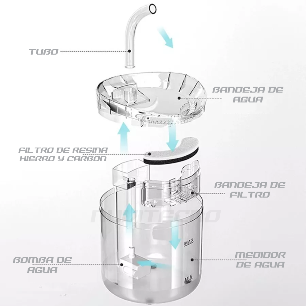 Con un grifo y modos de sobretensión de resorte que coinciden con los hábitos de beber de gatos, perros y otras mascotas.