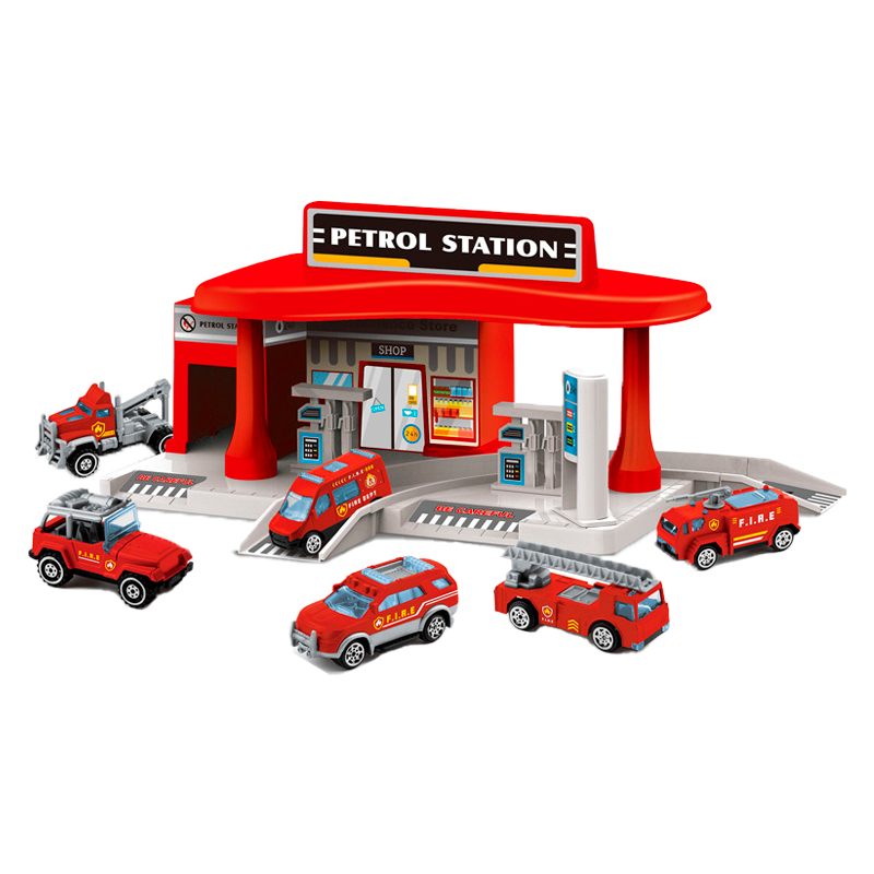 Coche de simulación de aleación de metal para niños, modelo transfronterizo, estación de servicio de ciudad, estacionamiento, lucha contra incendios, juguete de estacionamiento de construcción para niños, pista de estacionamiento para autos.