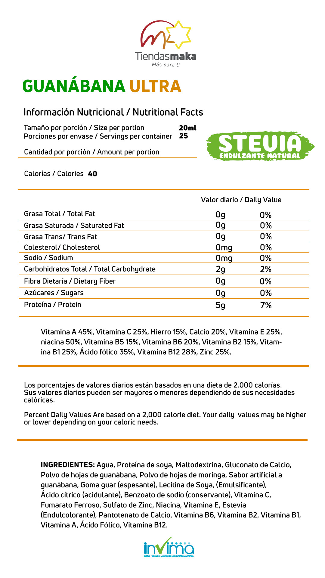 El Guanábana Ultra es un Suplemento alimenticio liquido a base de extracto de guanábana natural, proteína de soya, reforzado con polvo de hojas de moringa y endulzado con Estevia
