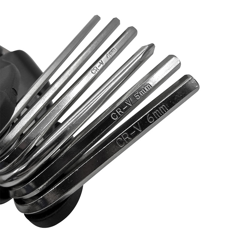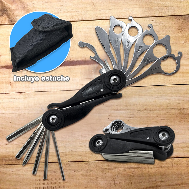 - Viene con estuche que incluye herramientas como: Llaves de 8mm, 9mm, 10 mm, 12 mm, 14 mm, mini Navaja aserrada, CR-V 4mm, 5 mm, 6mm, destornillador de estrella y otras útiles herramientas.