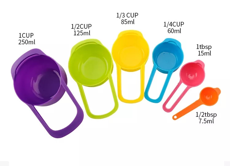 Practico set de 6 cucharas medidoras de alta calidad elaboradas en PP, ideales para ingredientes líquidos y secos. Las cucharas son muy livianas y fáciles de lavar además son la herramienta de medición esencial en el proceso de repostería y cocina en general.