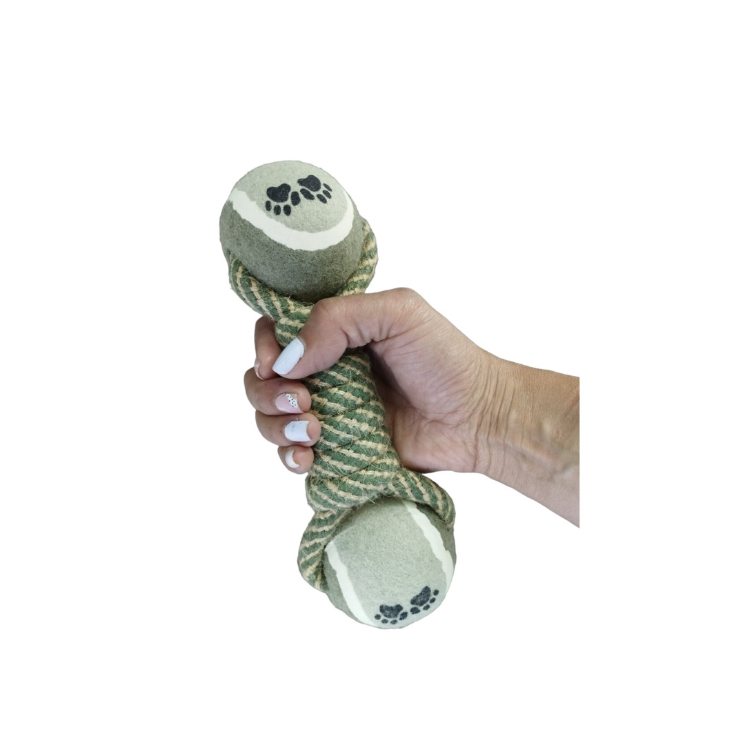 *Juguete de palo duradero: combina dos pelotas de tenis con una cuerda de algodón para formar un juguete masticable para perros en forma de varilla.