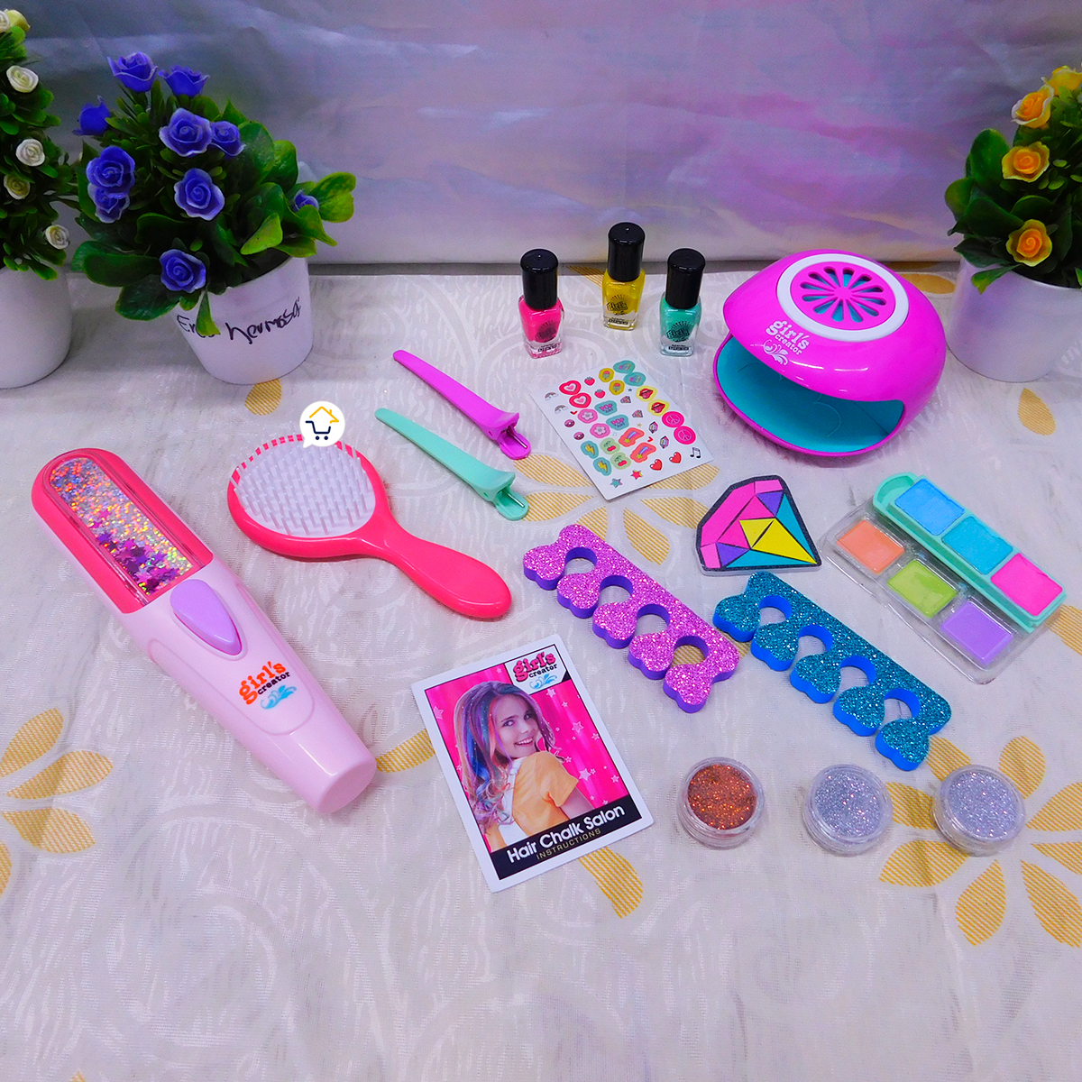 - El set incluye: Lámpara secadora de uñas, plancha pinta cabello, pinturitas para plancha, styckers para uñas, pinzas para cabello, barniz, separadores de dedos, glitters, cepillo y lima.