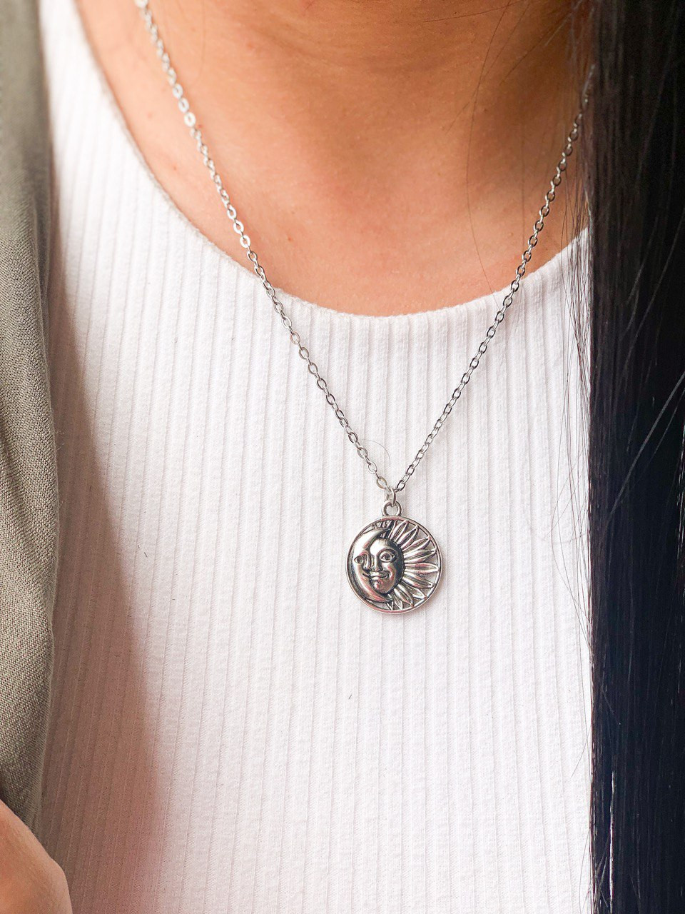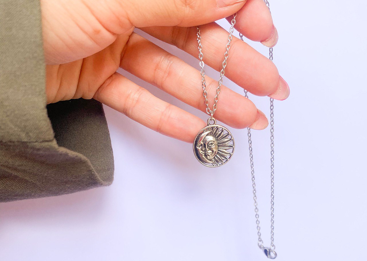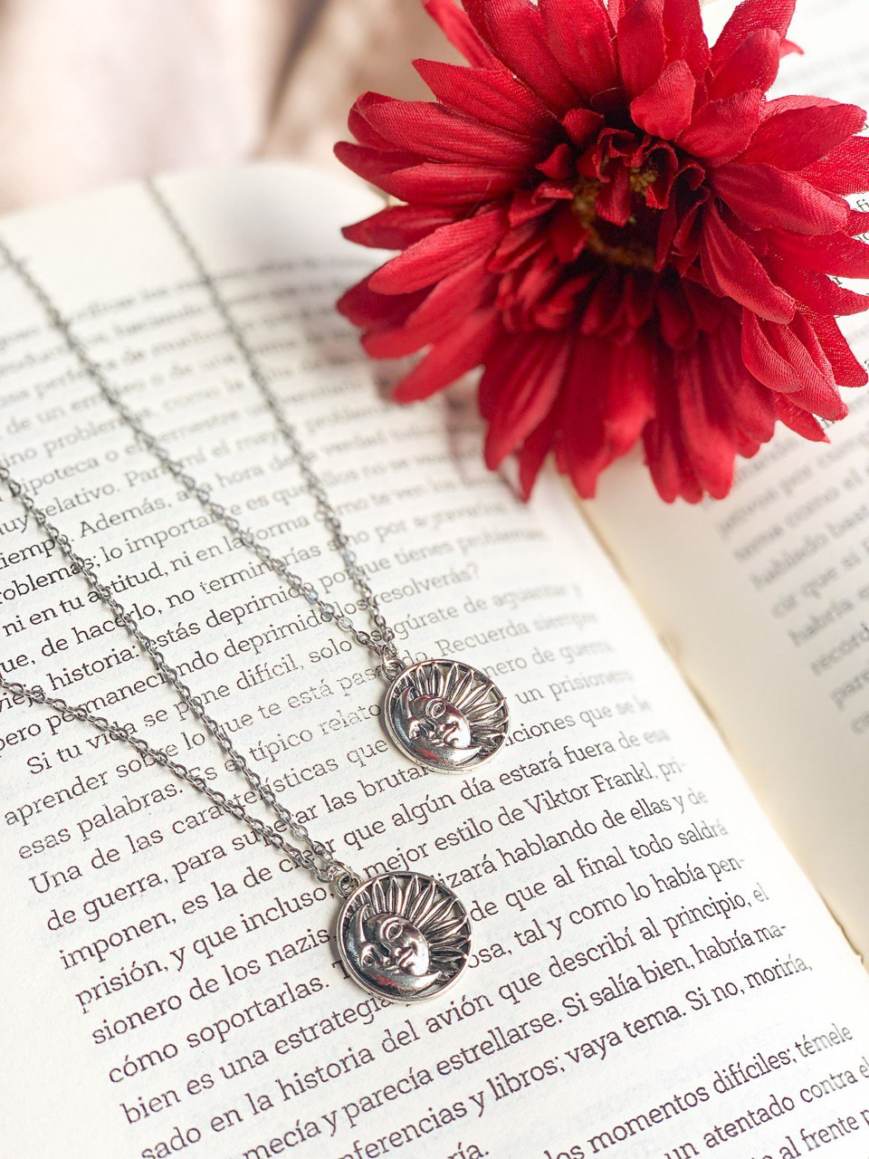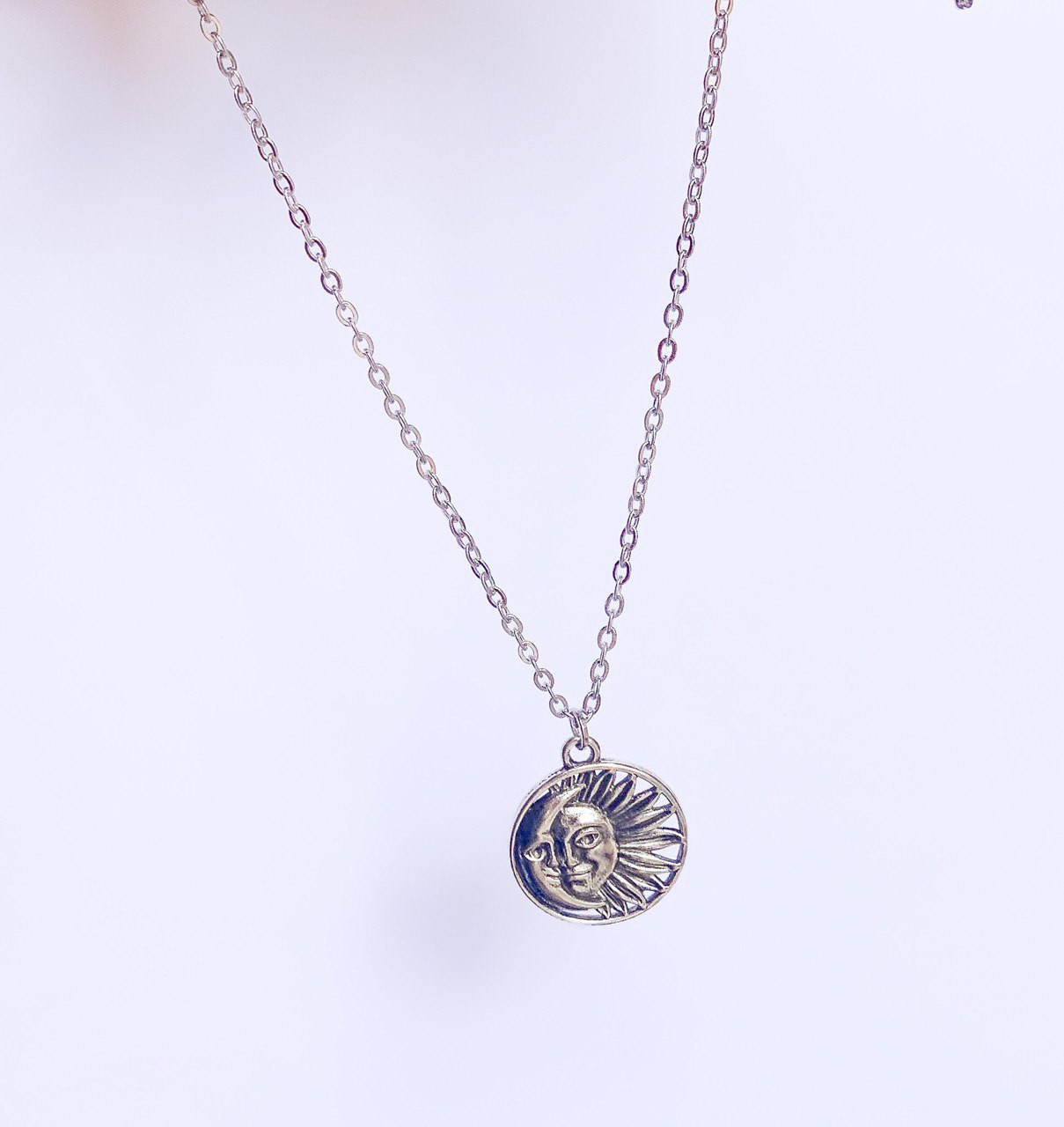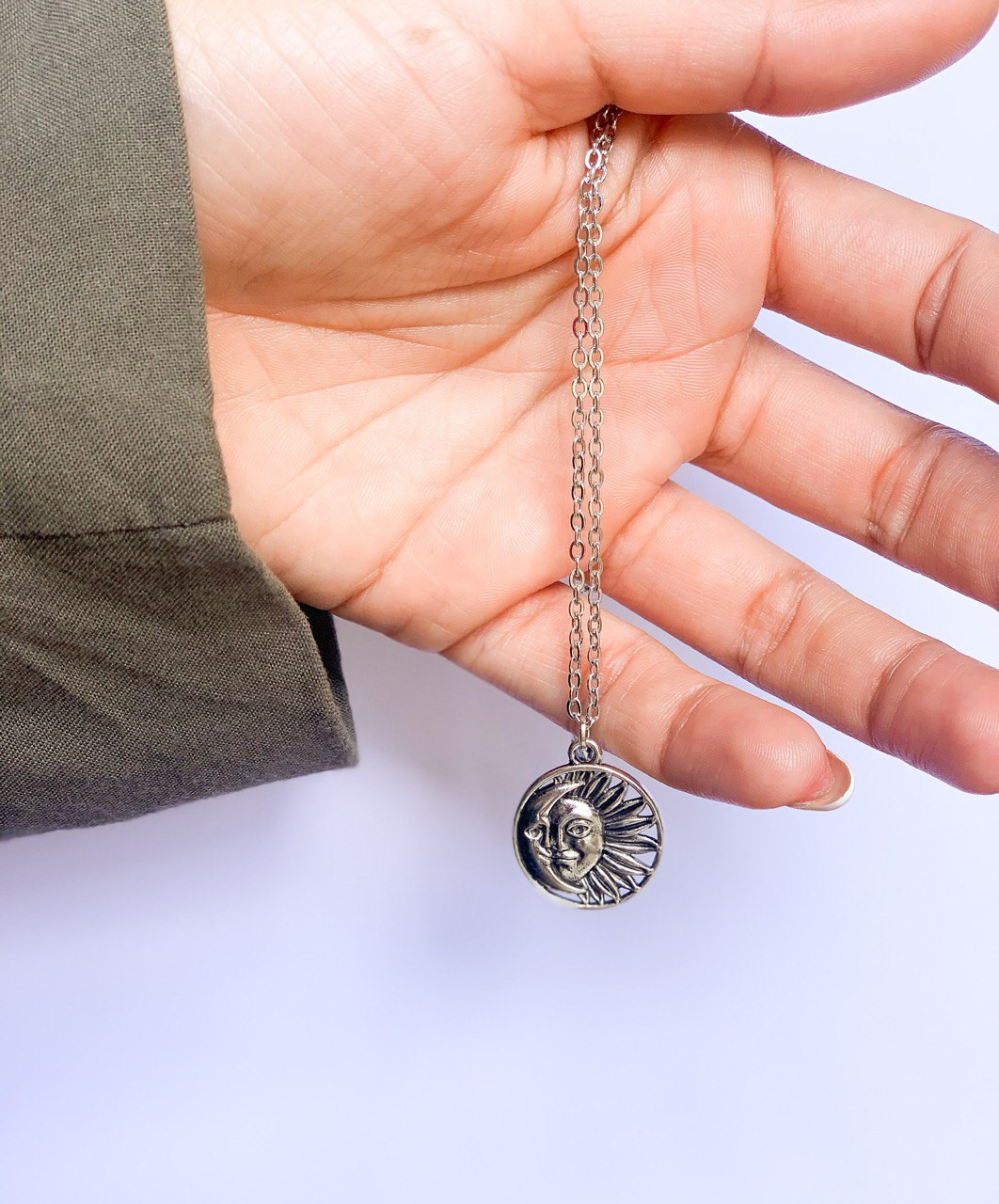 Su dije es tallado a mano y su figura es un soy y una luna en un dije circular y su medida es de 1.5.