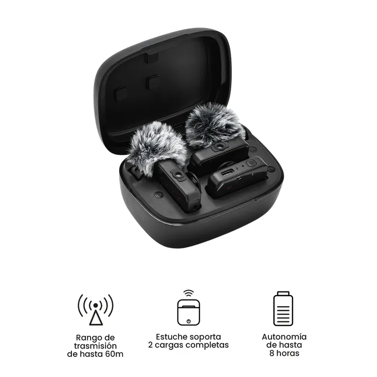 [2=Tipo de Microfono=Unidireccional, 4=No. Microfonos en el Empaque=2 Unidades, 5=Tipo de Usuario=Principiante, 3=Conexión=Inalámbrica, 1=Duracion de la Bateria=9 Horas Aproximadas]
