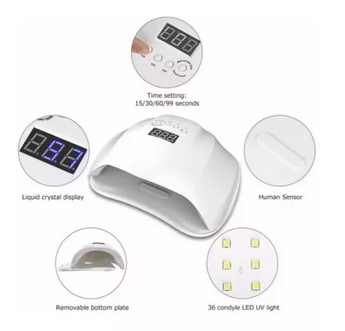 LÁMPARA PROFESIONAL UV LED DE 72W, SECADO RÁPIDO lámpara de curación avanzada y 72w de doble potencia emite luz inofensiva más segura y eficaz más rápido Opciones de secado flexible con 3 controles de tiempo preestablecidos: modo de calor bajo, 10s, 60s, 90s. @@~ CARACTERÍSTICAS @@• LEDS de doble fuente de luz (365 405 nm) para secado en gel UV Gle/Builder/LED Gel @• 36 LEDs colocados estratégicamente mente, sin zona muerta @50,000 horas de vida @• Potencia 72W @• Tamaño ideal para pies o manos @• Profesional @• Voltaje 110v @• Sirve para todo tipo de esmaltes de uñas @• Base removible @• Sensor automático @• 4 tiempos: 10s,30s,60s, temporizador 99s (la opción 10s, acorta el tiempo de secado en un 50%. Modo de calor bajo : 99s, protege la piel y los ojos) @@QUE TE INCLUYE @@• Lampara Uñas