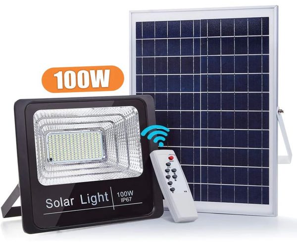 El reflector solar es la solución perfecta para poder brindar iluminación a zonas que no la tengan sin tener que realizar ninguna instalación eléctrica extra. El reflector solar puede funcionar durante 8 a 10 horas, se carga con el panel solar que trae adjunto. El principal beneficio que tiene el reflector son sus células fotovoltaicas que permite eficientizar su uso, ya que el panel se prende solo cuando detecta que es de noche. El equipo tiene una vida útil de 10 años. 9000 Lumen Panel Solar Baterias de Litio Fotocelula Control Remoto para Programar. @@Se puede utilizar ampliamente para la agricultura, en el domicilio, para las actividades al aire libre, en el puente, el parque, al gran edificio, el almacén, el Mercado, al muelle, a la estación, a la sala de exhibición, a la estación de gas de la mina, a la estación de peaje de la El panel solar, se carga a través del día a partir de los rayos del sol. @@Con el control remoto, puede programar la luz para que se encienda automáticamente al caer la noche o puede dejar encendido todo el tiempo, puede encender y apagar cuando lo necesite, por lo que es la solución de seguridad perfecta para su hogar. @@@@Potencia: 100W @Flujo Luminoso 9000 lúmenes @Promedio de vida 50000 horas @Tiempo de batería: 8 a 10 horas con batería cargada @Cuerpo de aleación de aluminio impermeable para prevenir la lluvia. @Control remoto no incluye baterías (2 AAA) y con interruptor de tiempo @Cable impermeable del panel solar de (2 metros) @Temperatura de color 6000K @Resistente al agua IP67 @Fácil instalación (viene con sus tornillos) @Panel Solar viene con su soporte. @Iluminación por mas de 8 hrs.