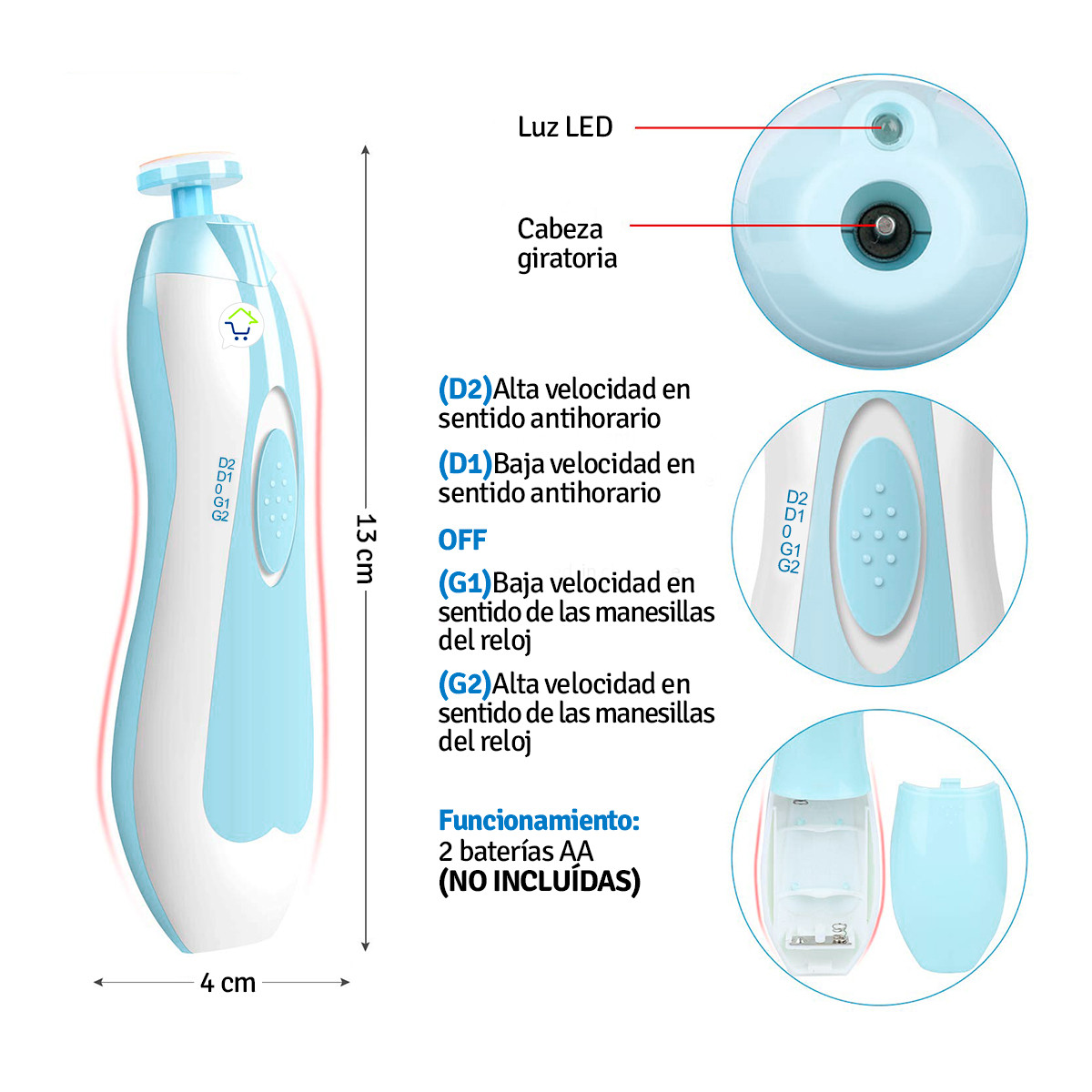 - Equipado con una potente luz led para limar las uñas del bebé mientras duerme plácidamente.
