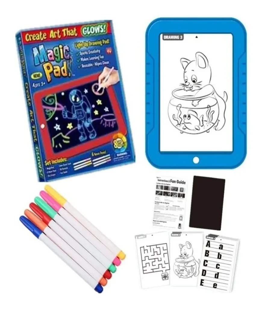 Tableta Magic Pad pizarra mágica para los pequeños de la casa! @Se divertirán dibujando y creando todo lo que imaginen, donde harán del aprendizaje un momento divertido. @@~ CARACTERISTICAS @@• Pantalla transparente reutilizable. @• rotuladores neón (NO tóxicos, NO son doble punta) @• Iluminación LED, funciona con 2 pilas AAA (NO incluidas) @• Dimensiones aproximadas de los marcadores: 10 cm de largo @• Dimensiones Tablero: 25.5 x 19 x 2 cm @@~ QUE TE INCLUYE @@• Tableta Magic Pad @• Rotuladores Neón @• Paño de limpieza @• Guía de uso