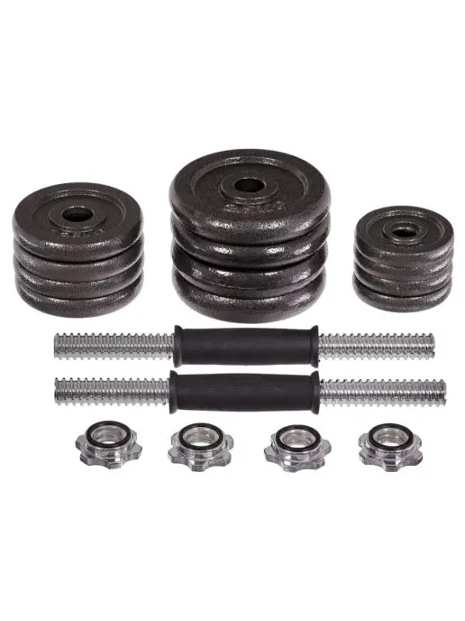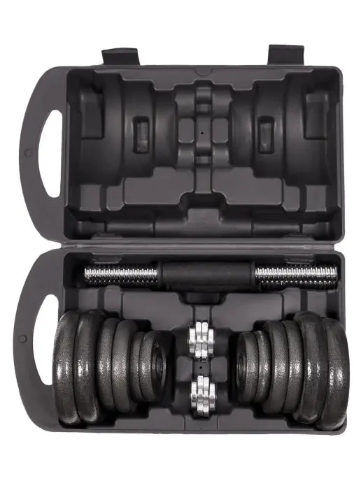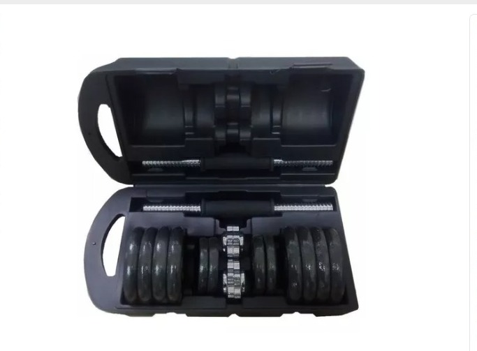 Juego Pesas Mancuernas 20 Kilos Gimnasio Portatil + Estuche KIT DE MANCUERNAS DE 20 KG (40 LB) 4 X 0.5 KG 4 X 1.25 KG 4 X 2.5 KG 4 X SPINLOCK COLLARS 2 X 35 CM (14″) Llegó el momento de poner a trabajar esos músculos con éste espectacular kit de mancuernas con agarre antideslizante y discos en acero, viene con un práctico maletín para que puedas transportarlo donde lo desees. Utiliza este espectacular set de mancuernas de 15 Kilogramos de peso ideal para tonificación muscular, fortalecimiento articular o recuperación y fisioterapia, compuesto por 12 discos en acero color negro, 2 barras con agarre antideslizante, 4 seguros de rosca mariposa y un practico maletín para transportarlo a cualquier lugar. Kit de mancuernas y pesas importadas con estuche que incluye: 4 discos en hierro fundido de 0,5 Kg cada uno 4 discos en hierro fundido de 1,25 Kg cada uno 4 collares roscados en hierro fundido 2 mancuernas cromadas de 35 cm con agarre antideslizante Estuche de transporte tipo maleta con agarre.