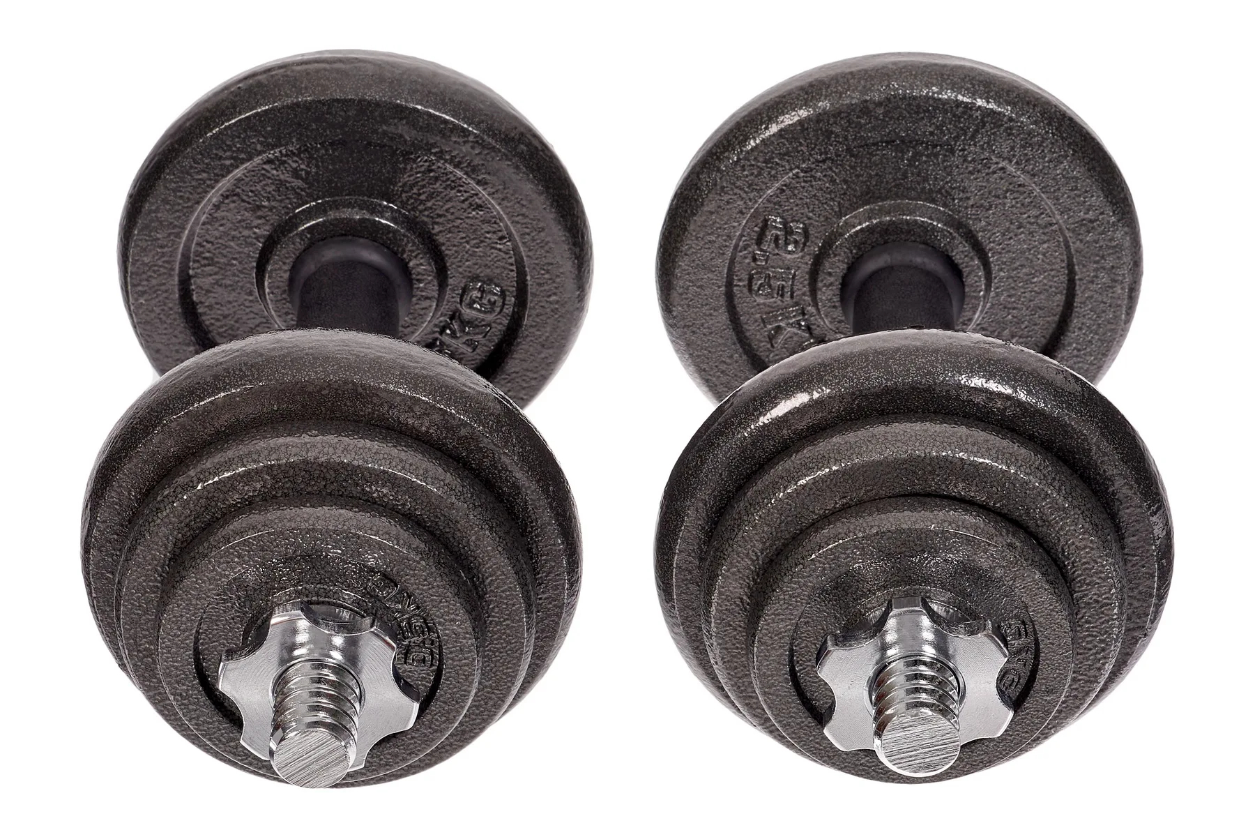 Estructura en Acero Diseño ergonómico 4 discos en hierro fundido de 0,5 Kg cada uno 4 discos en hierro fundido de 1,25 Kg cada uno 4 collares roscados en hierro fundido 2 mancuernas cromadas de 35cm con agarre antideslizante