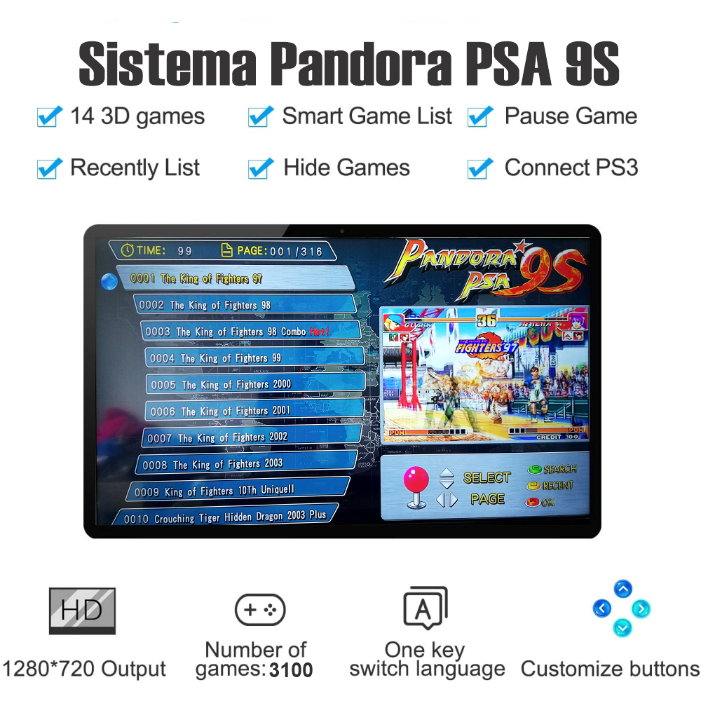 Características: Construido en 3100 juegos clásicos, experiencia arcade genial. Placa principal de alta tecnología, chips, hardware. Compatible con pantalla HD de audio y vídeo de 1280*720. Altavoz transparente integrado, volumen ajustable. Doble palancas para 2 jugadores, equipado con 14 botones (cada 800.000 tiempo de uso, sensible). Conéctese a TV/PC/Arcade a través de salida HDMI o VGA y cable. Proporciona cable USB 2.0 de alta velocidad para conectar la tableta PC/PS3 directamente. Funciones: Almacenar datos del juego, pausar el juego, tiempo de carga rápida, retroceso automático de 3 minutos. Función. Ventilador de CPU de aluminio, buena capacidad de disipación de calor y servicio a largo plazo.