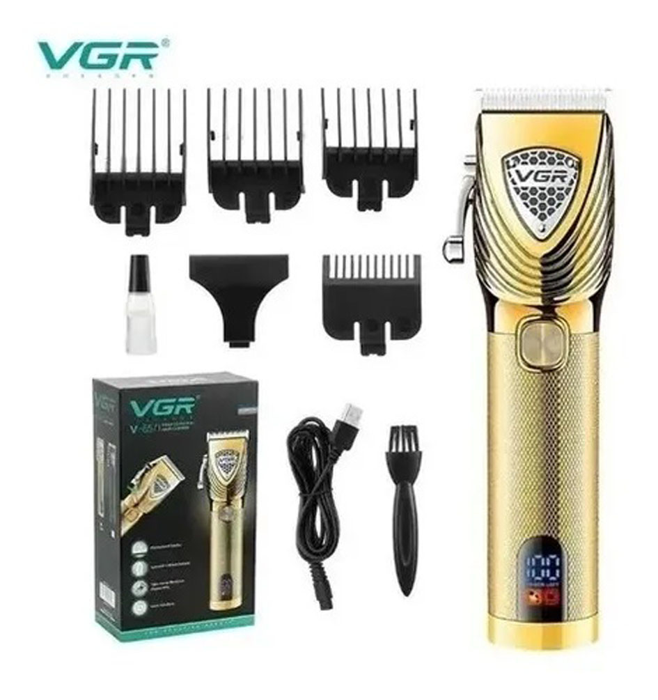 Máquina para cortar pelo profesional marca VGR recargable con indicador de batería, la batería tiene una duración de 3 horas, sus cuchillas en acero inoxidable hacen que su corte sea más preciso y su motor de alta revolución es muy silencioso, tiene el peso adecuado para que sea cómoda de manejar, el cable con el cual se carga se puede conectar a cualquier cabeza de celular para que sea fácil y rápido de cargar.