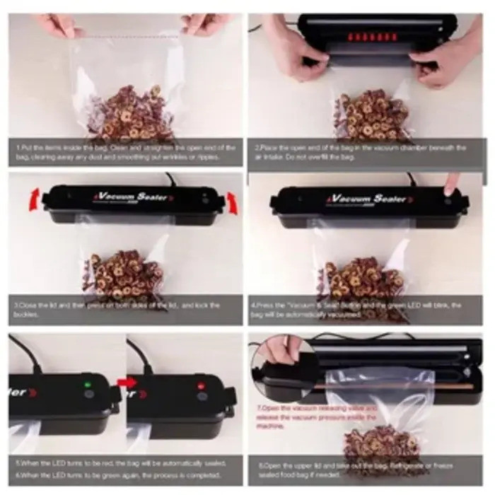 MAQUINA SELLADORA DE BOLSAS AL VACIO @ideal para uso domestico y almacenes alimentos para conservarlos. @@CARACTERÍSTICAS @-Voltaje: CA 110V-120V / 60Hz @-Poder: 90W @-GW: 0,7 kg @-Tamaño del producto: 37 x 7 x 5,2 cm @-Bolsas de vacío: L25 x 20 cm (15 piezas) @-Grados de vacío: -45Kpa / -60Kpa @@VENTAJAS: @1.Elimina las quemaduras del congelador, reduce el deterioro y el desperdicio de alimentos. @2.Fresco, antibacteriano, a prueba de humedad, a prueba de moho, antioxidante. @3.Operación de sellador al vacío con un solo toque, fácil de usar. @4. Bajo nivel de ruido, baja vibracion. @@TE ENTREGAMOS @1-Maquina selladora al vacio