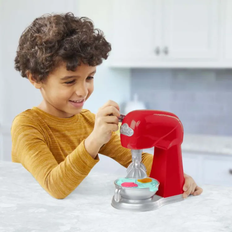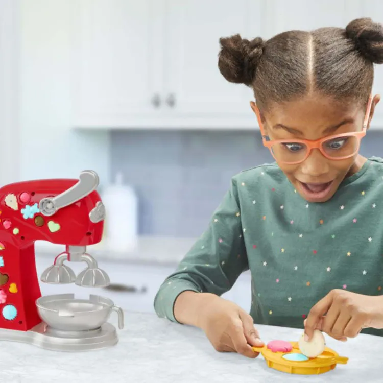 Incluye: batidora con bowl removible, 1 extrusor, 1 espátula, 2 bandejas de moldes y 5 latas de masa para moldear Play-Doh (contenido neto: 283 g).
