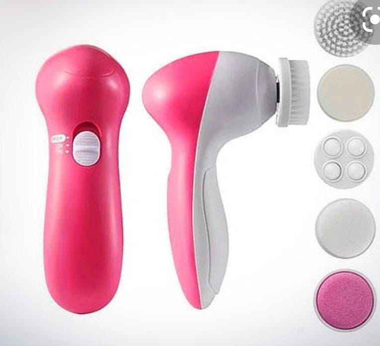 Aquí está el masajeador de cuidado de la belleza 5 en 1 operado con batería. Es operado por baterías 2AA (no incluidas), tiene 5 accesorios: