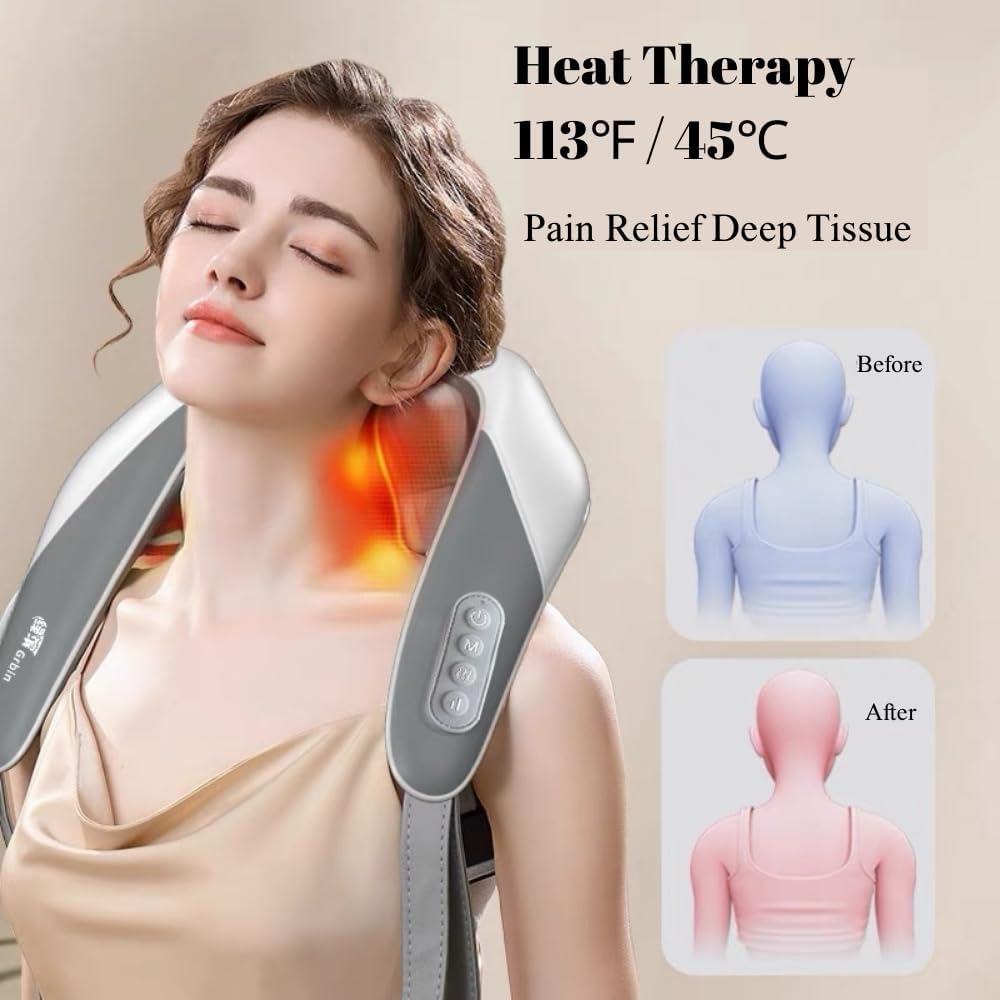 Simula el agarre y amasado de la mano humana: Los masajeadores para cuello y hombros con calor están diseñados para simular la tensión y la fuerza de los dedos humanos, amasando bien el hombro acupuntura hacia arriba y presionando el músculo trapecio hacia abajo. Para proporcionar una experiencia de masaje profundamente relajante.