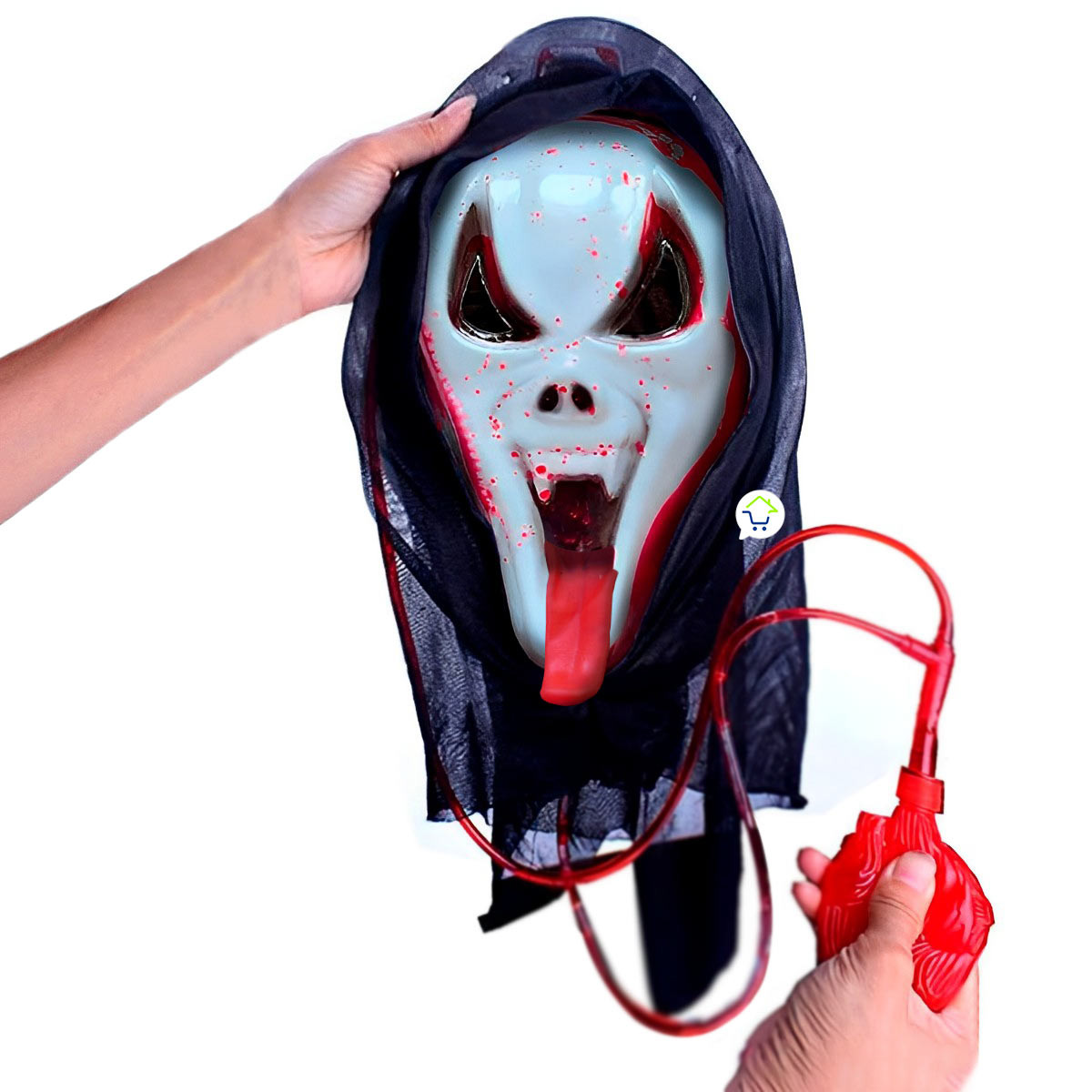 • Máscara con red sellada de tubería que permite que la sangre falsa fluya fácilmente.