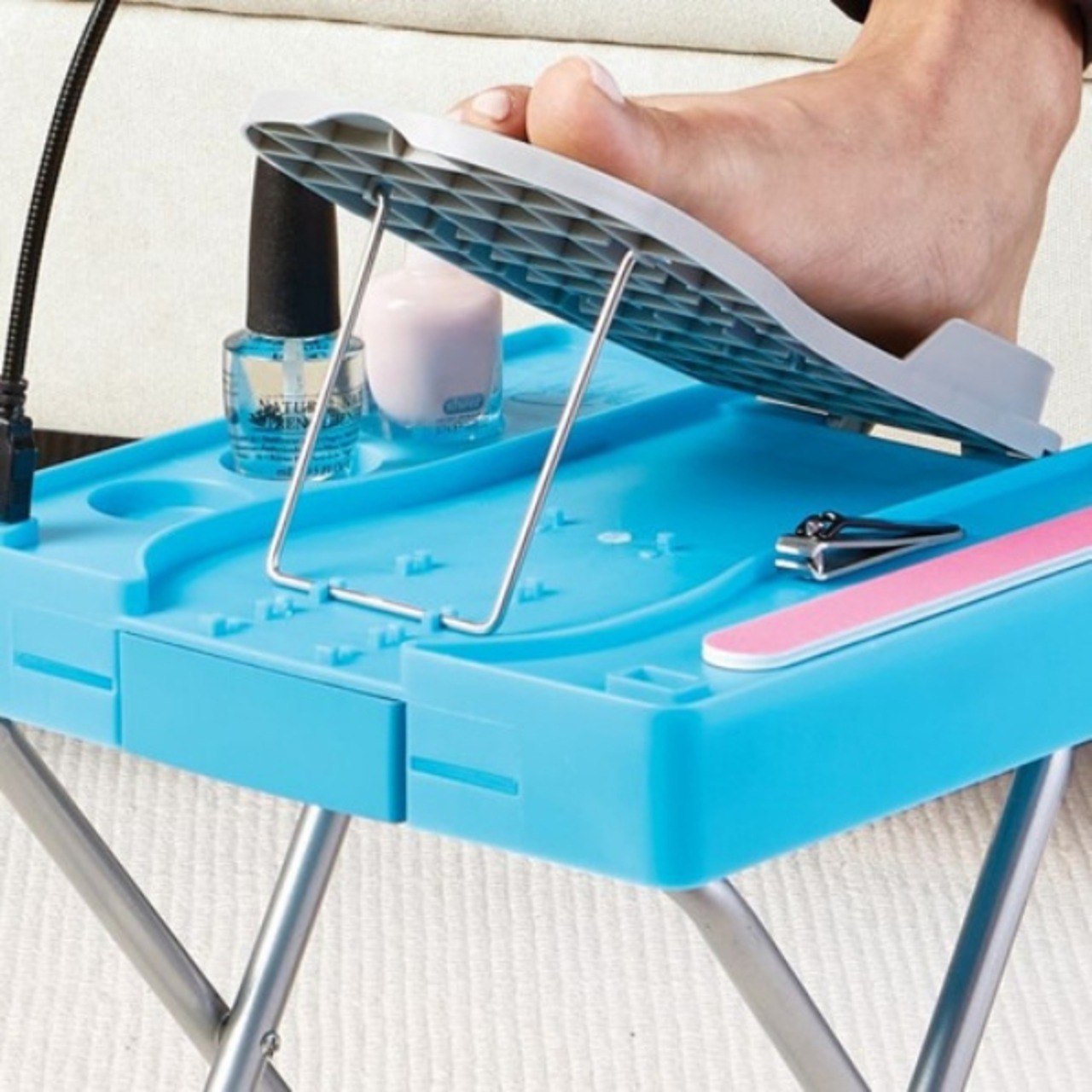 Reposapies ajustable con diseño innovador en ángulo que mantiene los pies en la posición perfecta para pintar cómodamente uñas en cualquier momento, en cualquier lugar para que no tengas que doblarte o estirarte. Proporciona una plataforma estable y antimicrobiana para que trabajes en uñas mientras estás en una posición cómoda en cualquier silla. Características del Producto: • Ventilador de secado • Plantilla ajustable • 3 Soportes para esmalte de uñas • Lupa iluminada lupa con luz usb y accesorio de ventilador de secado usb Robustas patas de metal con empuñaduras antideslizantes 5 posiciones de pie ajustables Compacto y portátil: se pliega para un fácil almacenamiento, o para llevarlo contigo donde quiera que vayas. No requiere carga, solo utiliza 4 pilas AA (no incluidas).