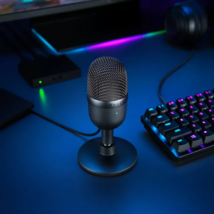 – Micrófono Seiren V3 Mini – Varilla de Soporte – Base de Soporte para escritorio – Cable USB tipo A a Tipo C – Guía de información importante del producto