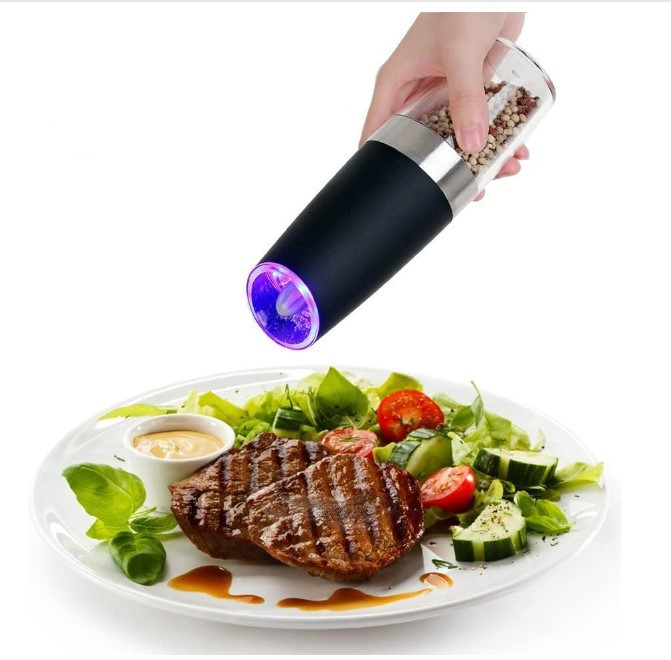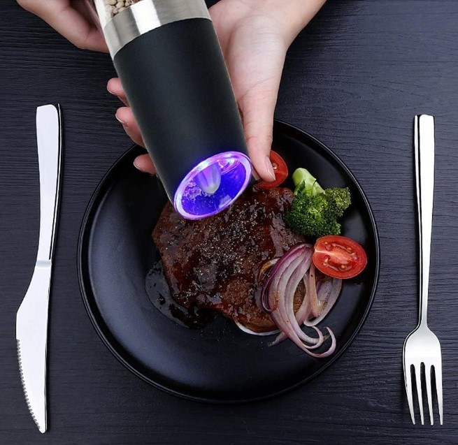 - Luz LED azul: cuando el molinillo está funcionando, emite una luz azul para recordarlo. La luz azul se encenderá con un simple giro de muñeca, podrás ver fácilmente la cantidad de sal y pimienta que pones en tu comida.