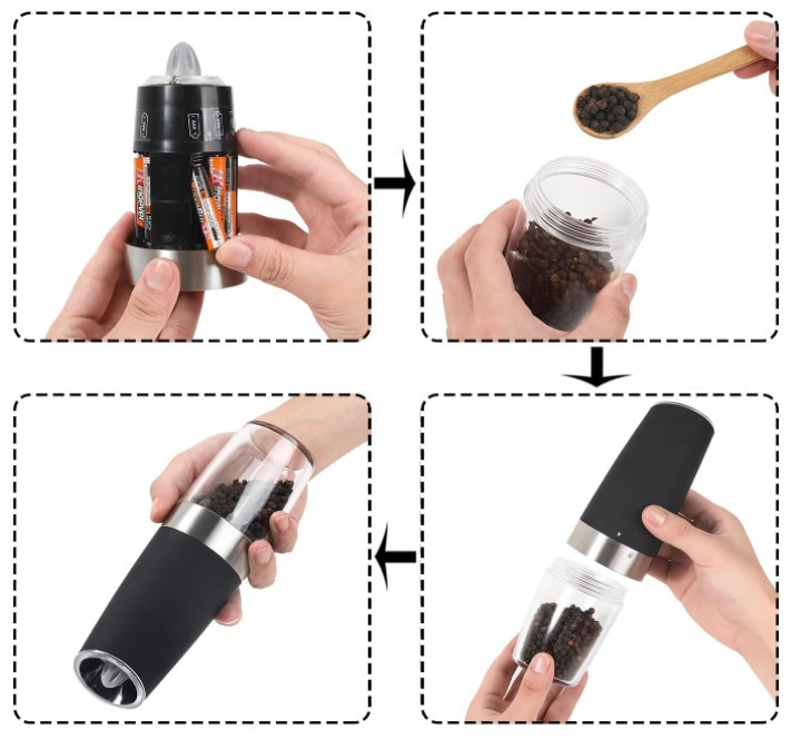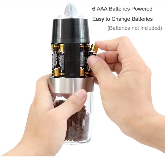 - Fácil de usar: el molinillo electrónico de pimienta utiliza un diseño avanzado de detección de gravedad, sin molienda manual, sin operación de botón, simplemente gira el molino, comienza a moler automáticamente. Es fácil de hacer con una mano y tienes especias frescas, sal o pimienta. Funciona con 6 pilas AAA (no incluidas).