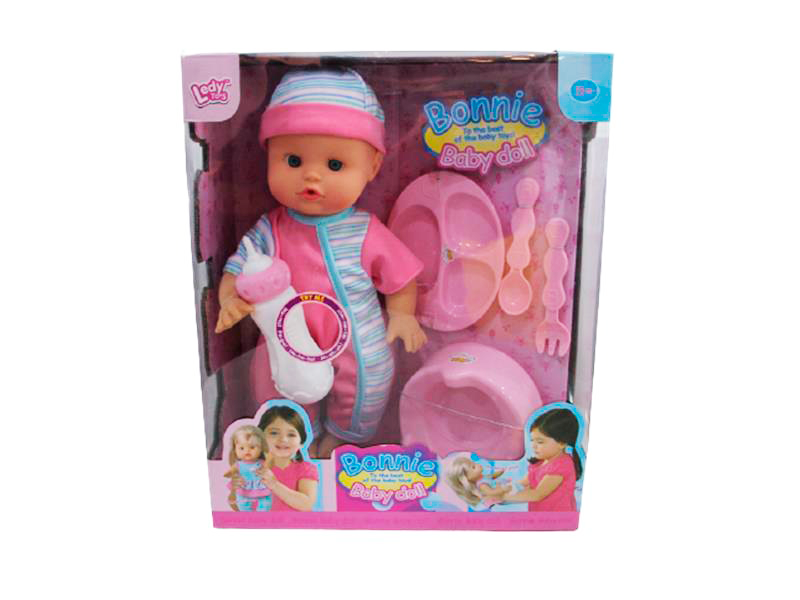 Conjunto con caja de regalo de muñeca de bebe con sonido, juguete con kit de cocina de bebe y su material es en plástico