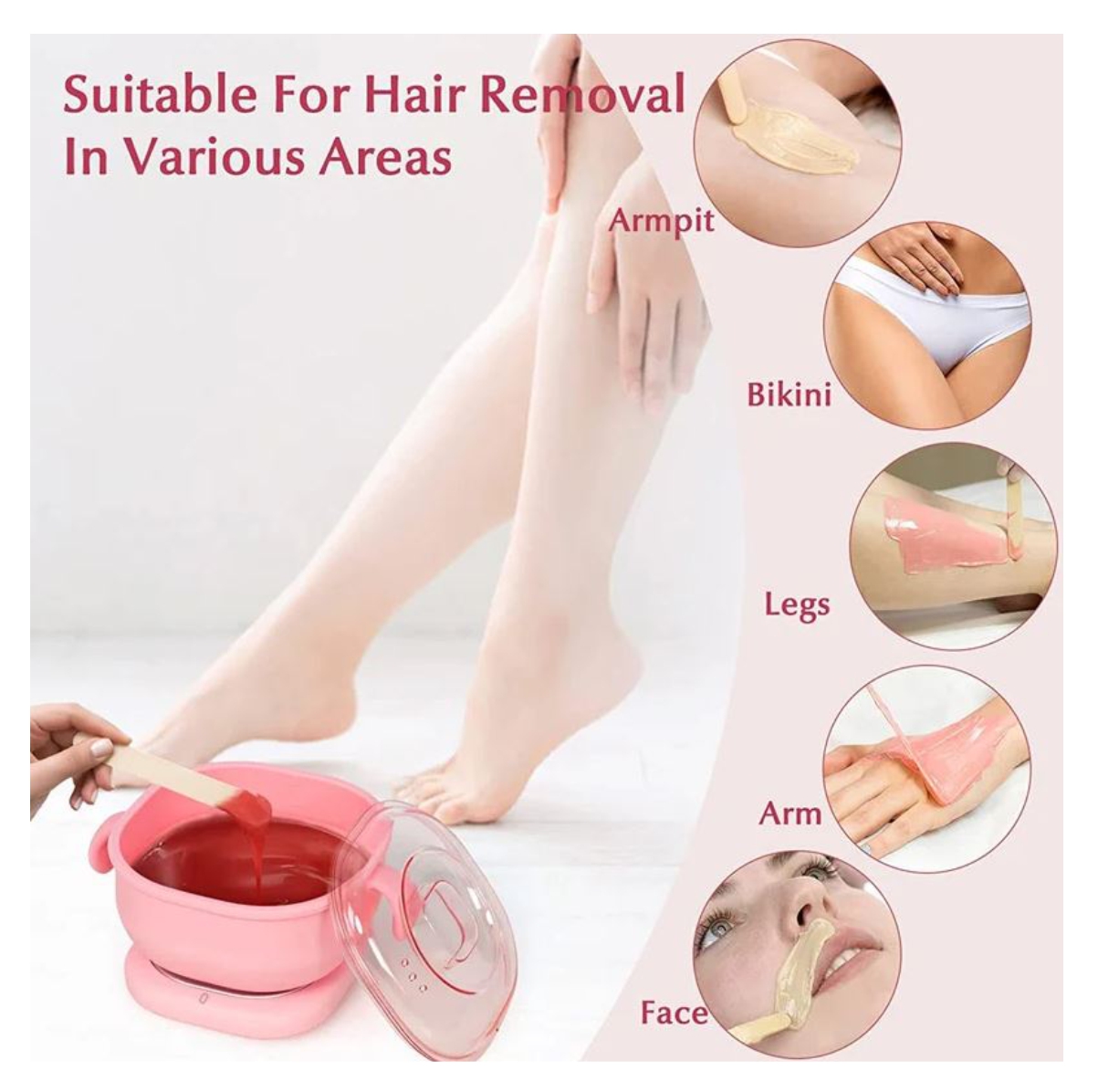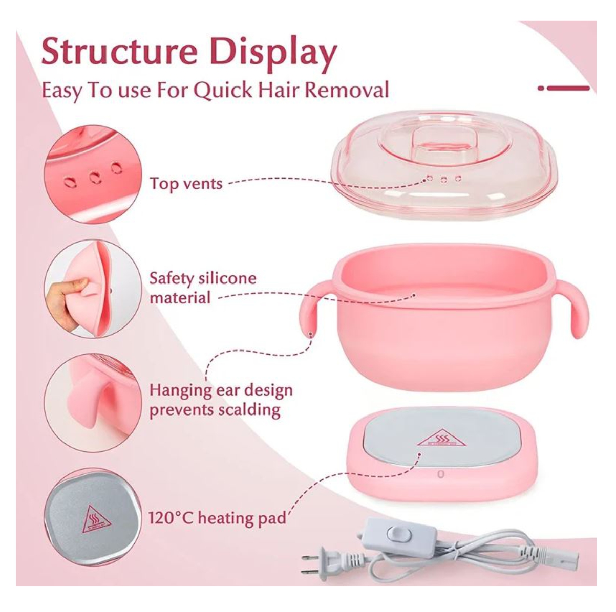 el recipiente de cera de silicona está diseñado con 2 asas para evitar quemaduras en las manos y facilitar su uso. Fácil de usar, diseño de interruptor, fácil de operar. La apariencia es simple y elegante, hermosa y práctica. Una herramienta esencial para alisar y suavizar la piel seca.
