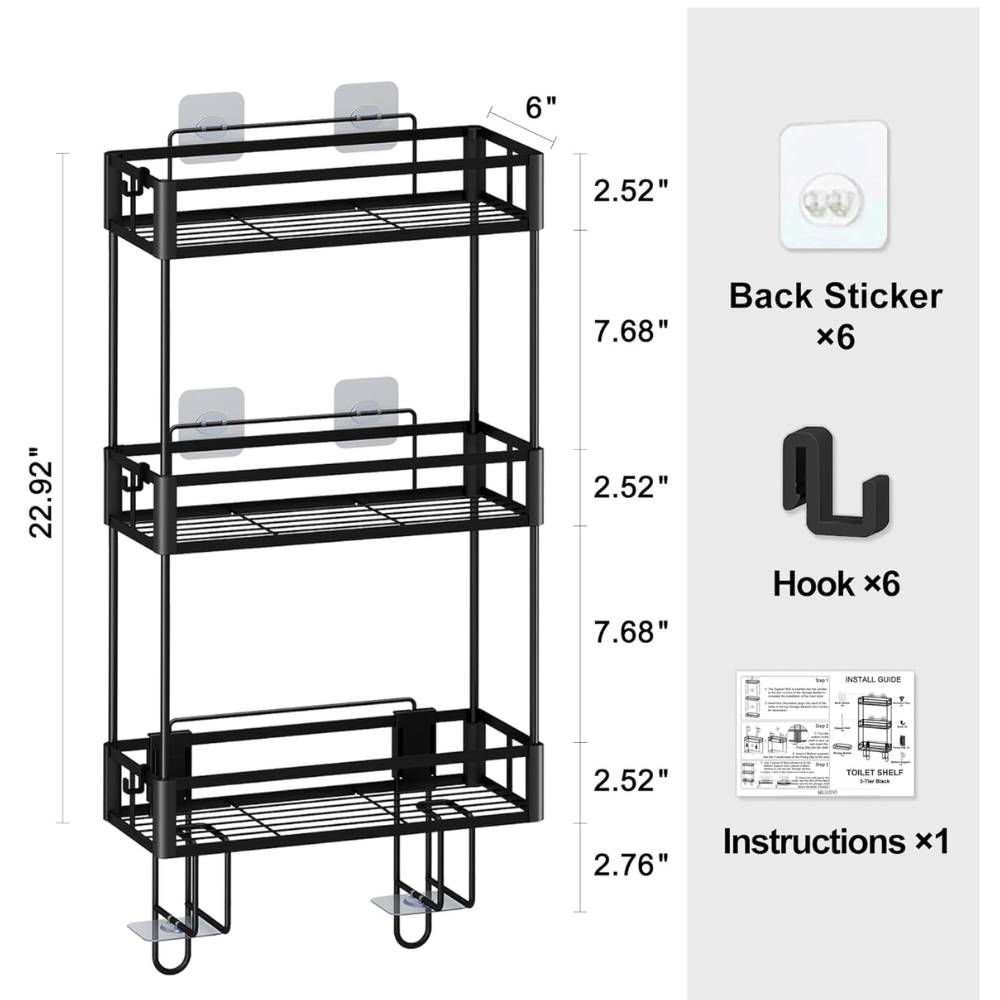 Excelente estabilidad y antiinclinación: El organizador de baño sobre el inodoro no solo está equipado con 6 calcomanías especialmente diseñadas para una fácil instalación en la pared y la tapa del inodoro, sino que también tiene 2 ranuras largas de hierro, que se pueden insertar fácilmente en el espacio entre la pared y el tanque de toliet. Asegurando la estabilidad y estabilidad del gabinete de almacenamiento del inodoro.