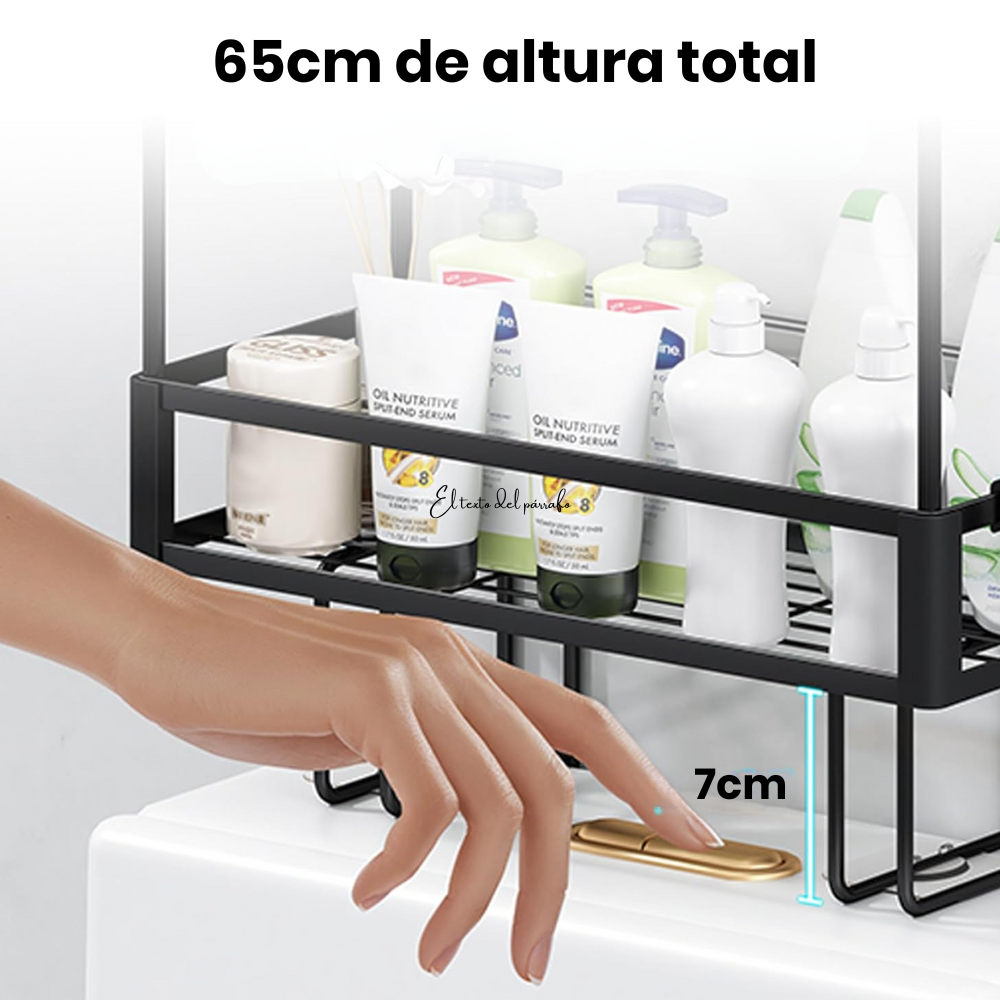 Tiene 2 ranuras largas de hierro especialmente diseñadas que se pueden insertar fácilmente entre la parte inferior del estante y el tanque del inodoro, 27cm pulgadas de altura que no afecta a presionar el botón del inodoro.