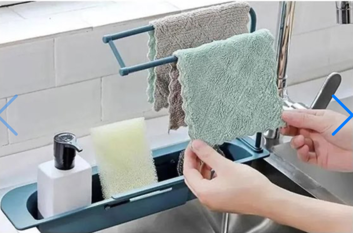 - Organizador de fregadero de cocina, soporte telescópico para fregadero, estante de secado de jabón de esponja, cesta de drenaje, organizador de estante y colgador ajustable con toallero