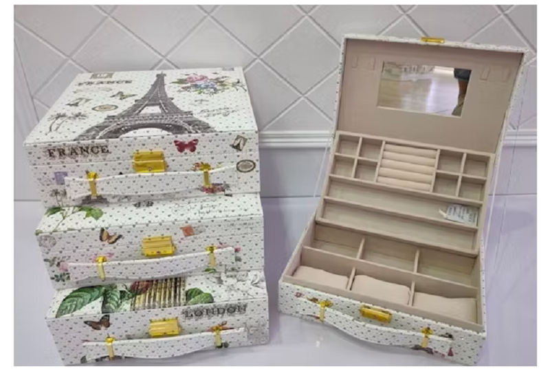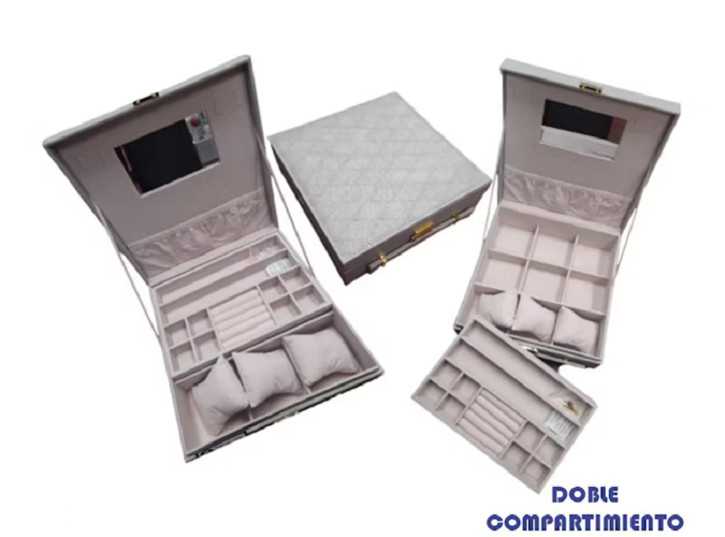 Ideal para almacenar y organizar tus anillos, collares, pendientes y otros artículos de joyería. Viene con llave para que mantengas tu caja privada. Viene con un espejo integrado en el interior de las tapas, más conveniente. La bandeja superior contiene dos compartimentos para el almacenamiento de artículos más pequeños y una sección central con rollos de anillo para sus anillos, además tiene 3 compartimientos para 3 relojes, arreglo racional para su arreglo de joyería. Hecho con asa para que puedas llevarlo a donde quieras. Bandeja superior con rollos de anillo, cajón extraíble con mango cromado, terciopelo Interior. Compartimiento grande para almacenar artículos más grandes de joyería