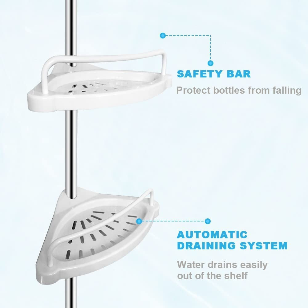 Práctico organizador de baño en esquinero. Hecho de acero inoxidable y plástico ABS, resistente y a prueba de óxido. Las estanterías reforzadas aseguran mayor capacidad de carga y durabilidad. Simplemente fíjelo entre el piso y el techo y la forma triangular se ajusta perfectamente a la esquina de la pared para ahorrar más espacio, convierta el baño desordenado en uno ordenado y limpio al instante.
