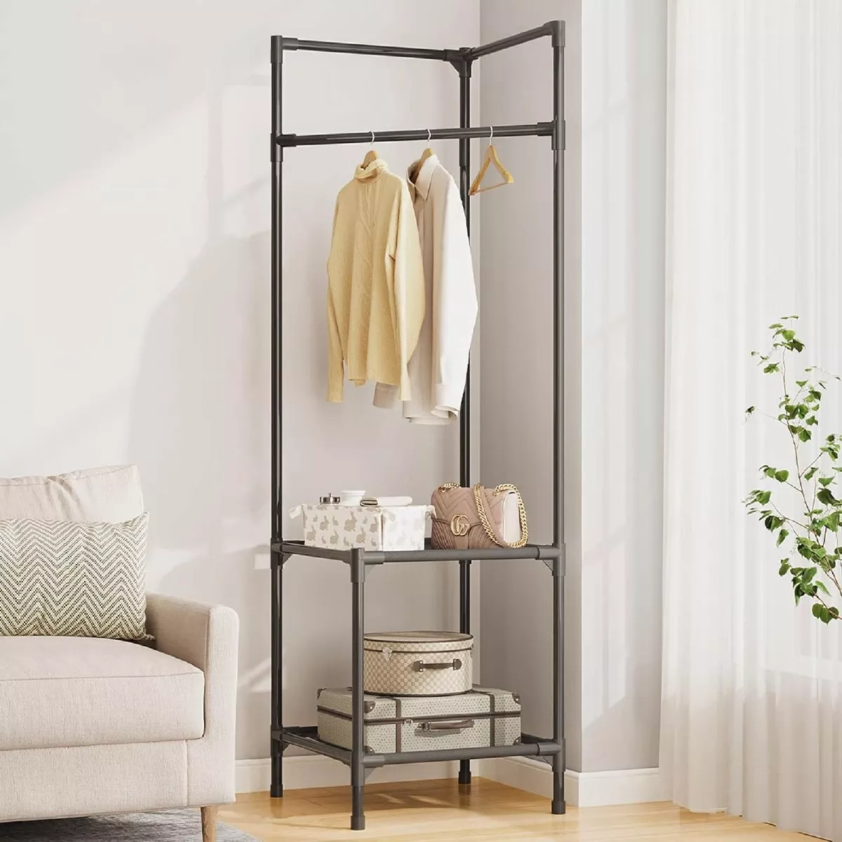 Perchero de Ropa Esquinero: Perchero de Esquina con Almacenamiento Está Hecho de acero Y Tela No Tejida de Lino Grueso. con Su Diseño Simple Y Elegante, el Perchero Independiente Combina Perfectamente con Casi Todos Los Demás Muebles.