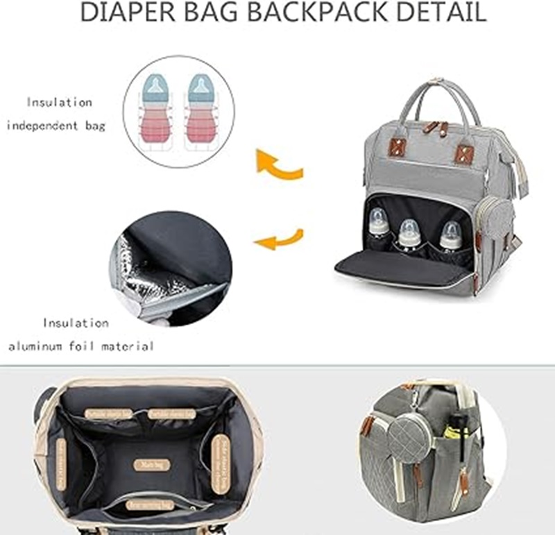 Puede obtener compartimentos bien estratificados para mantener separados los pañales húmedos y secos, biberones, paños de pañales; bolsillos laterales para toallitas de bebé, paraguas, biberones o más; 2 bolsillos aislados para botellas de 4-9oz; súper fácil de ver y fácil de alcanzar a través de la boca abierta y la cremallera en la parte posterior.