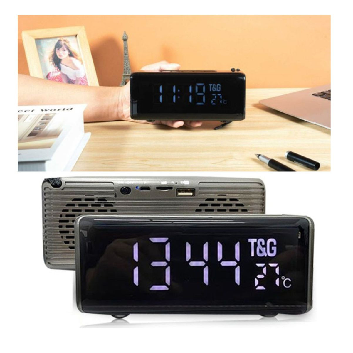 Parlante radio reloj portátil T&G 174 con alarma. Reloj de tiempo y pantalla de temperatura de soporte. Reproduce música vía Bluetooth, USB, microSD, auxiliar, además tiene radio FM.