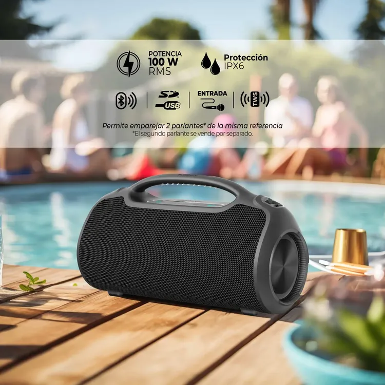 [2=Forma de Conectividad=Bluetooth, 4=Medidas del Parlante, Barra o Subwoofer (Ancho x Alto x Fondo) En Cm=46,8 x 25,4 x 17,5 Centímetros, 3=Resistencia al Agua=Resistencia contra los aguaceros (IPX6), 1=Potencia RMS=100 Watts]