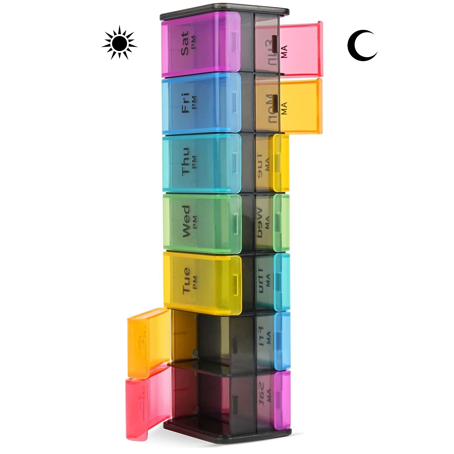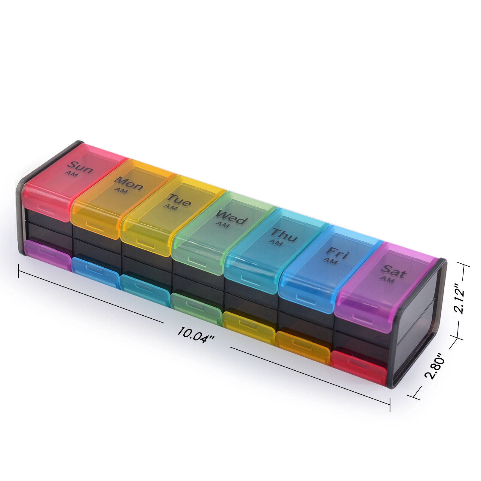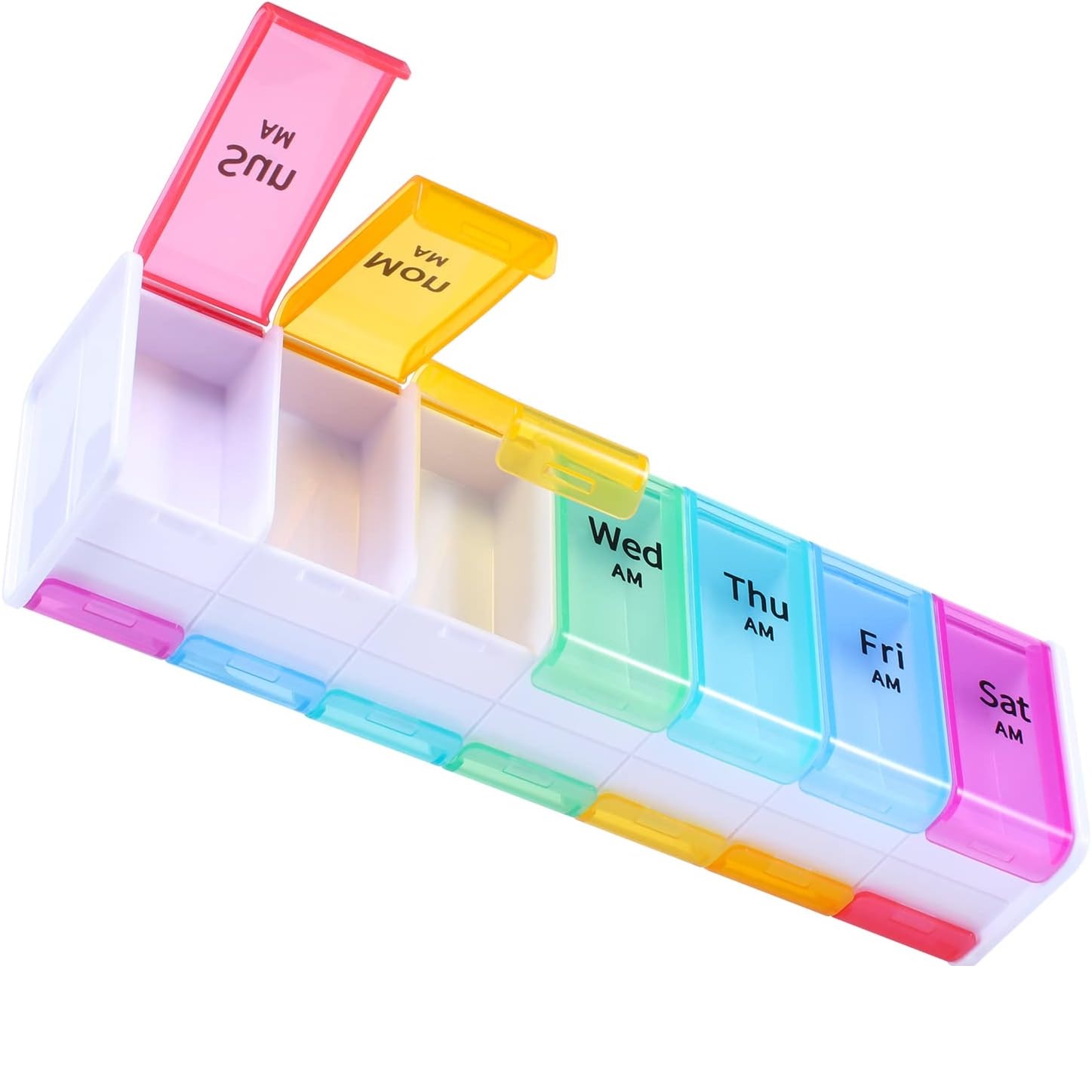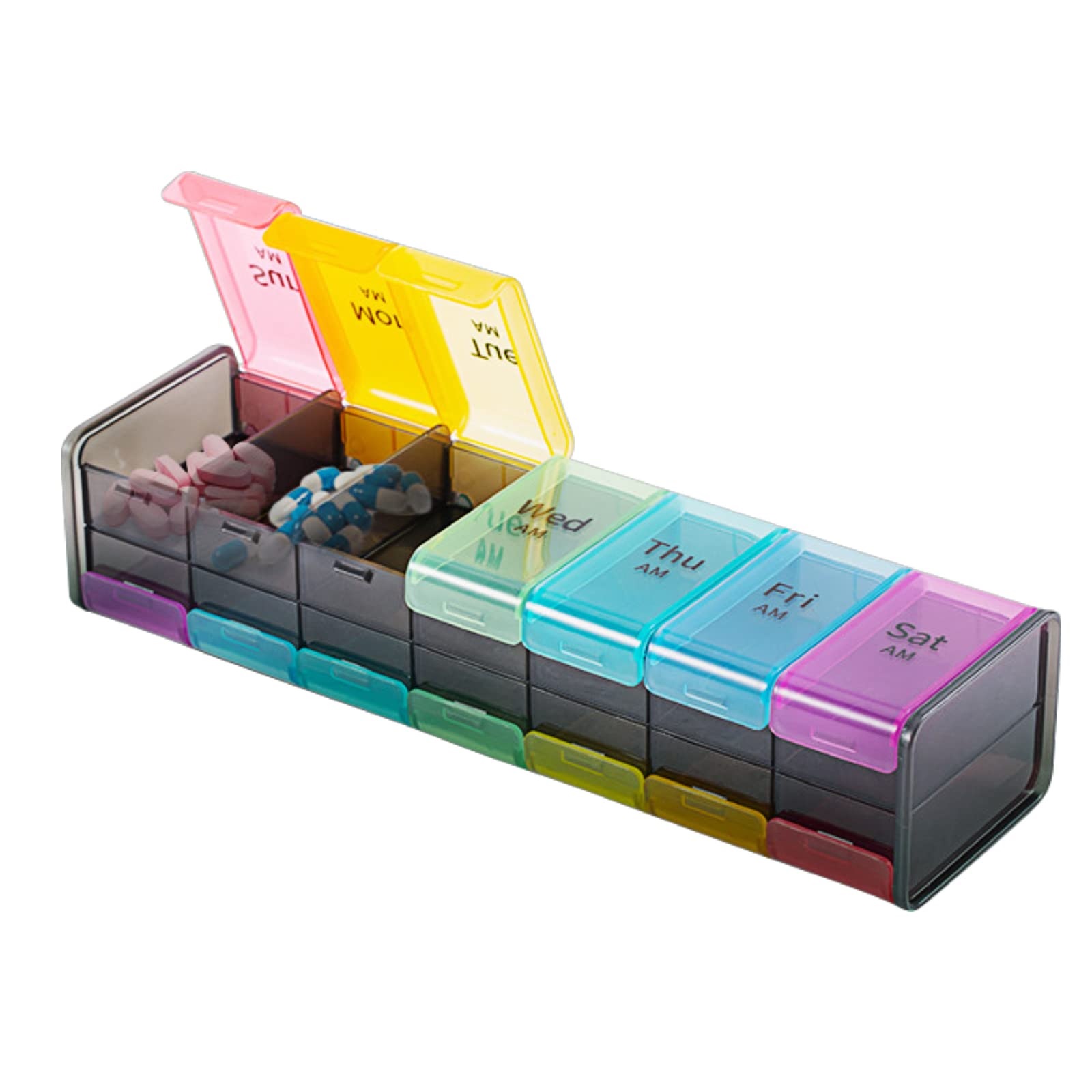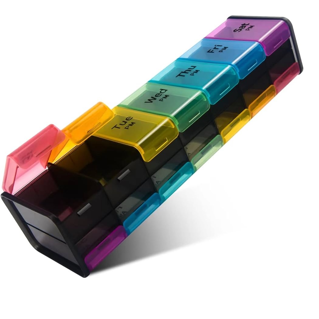 El organizador tipo pastillero XL es duradero y atractivo. Sus características incluyen compartimentos de doble cara, diferentes colores y almacenamiento adicional.