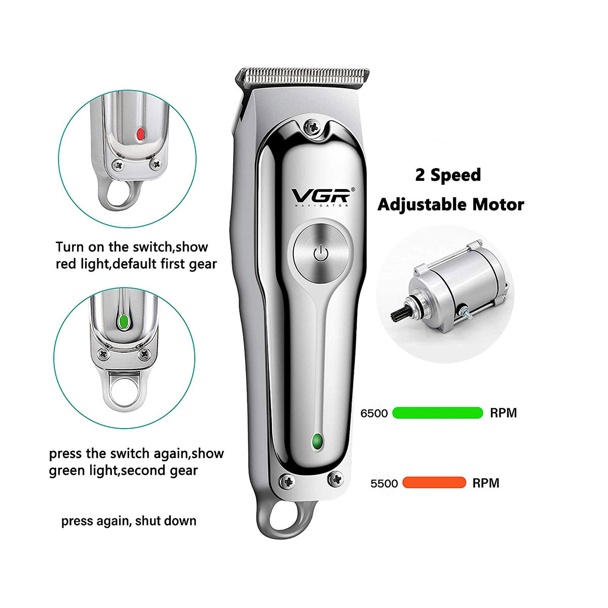 Hoja de acero al carbono, diseño compuesto de doble capa. La hoja de acero al carbono no atrapa el cabello y puede cuidar rápidamente de la cabeza calva, la gradación del recorte, la escultura y otros peinados. Cuerpo de la Maquina en PVC color Metalico lo cual la hace ligera y resistente.