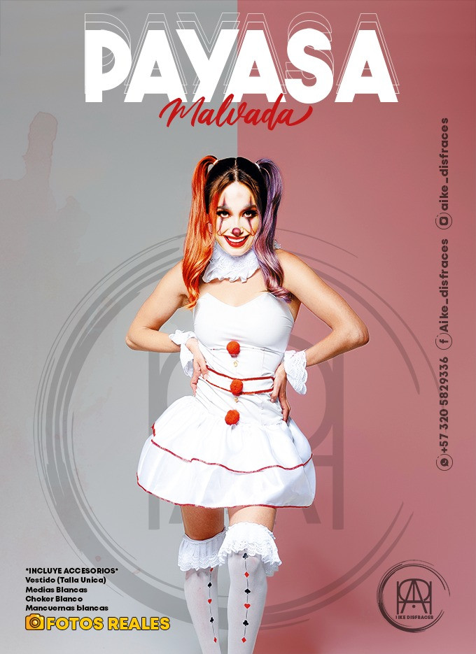 Disfraz de payasa, Talla única (para chicas de XS hasta M) el precio incluye el vestido, medias, mancuernas y cuellero.