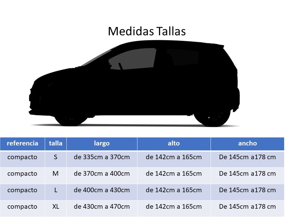 Pijama para coche tipo con medidas universales. @ideales para carros con medidas de @@Talla S @LARGO: desde 335cm hasta 370cm. @ANCHO: desde 145cm hasta 178cm. @ALTO: desde 142cm hasta 165cm. @@Talla M @LARGO: desde 370cm hasta 400cm. @ANCHO: desde 145cm hasta 178cm. @ALTO: desde 142cm hasta 165cm. @@Talla L @LARGO: desde 400cm hasta 430cm. @ANCHO: desde 145cm hasta 178cm. @ALTO: desde 142cm hasta 165cm. @@Talla XL @LARGO: desde 430cm hasta 470cm. @ANCHO: desde 145cm hasta 178cm. @ALTO: desde 142cm hasta 165cm. @@Protección contra polvo @Protección contra sol (refleja los rayos ultra violeta) @Protección contra lluvia con una resistencia de hasta el 90% @Contra desechos de aves @recurso para ajuste contra viento