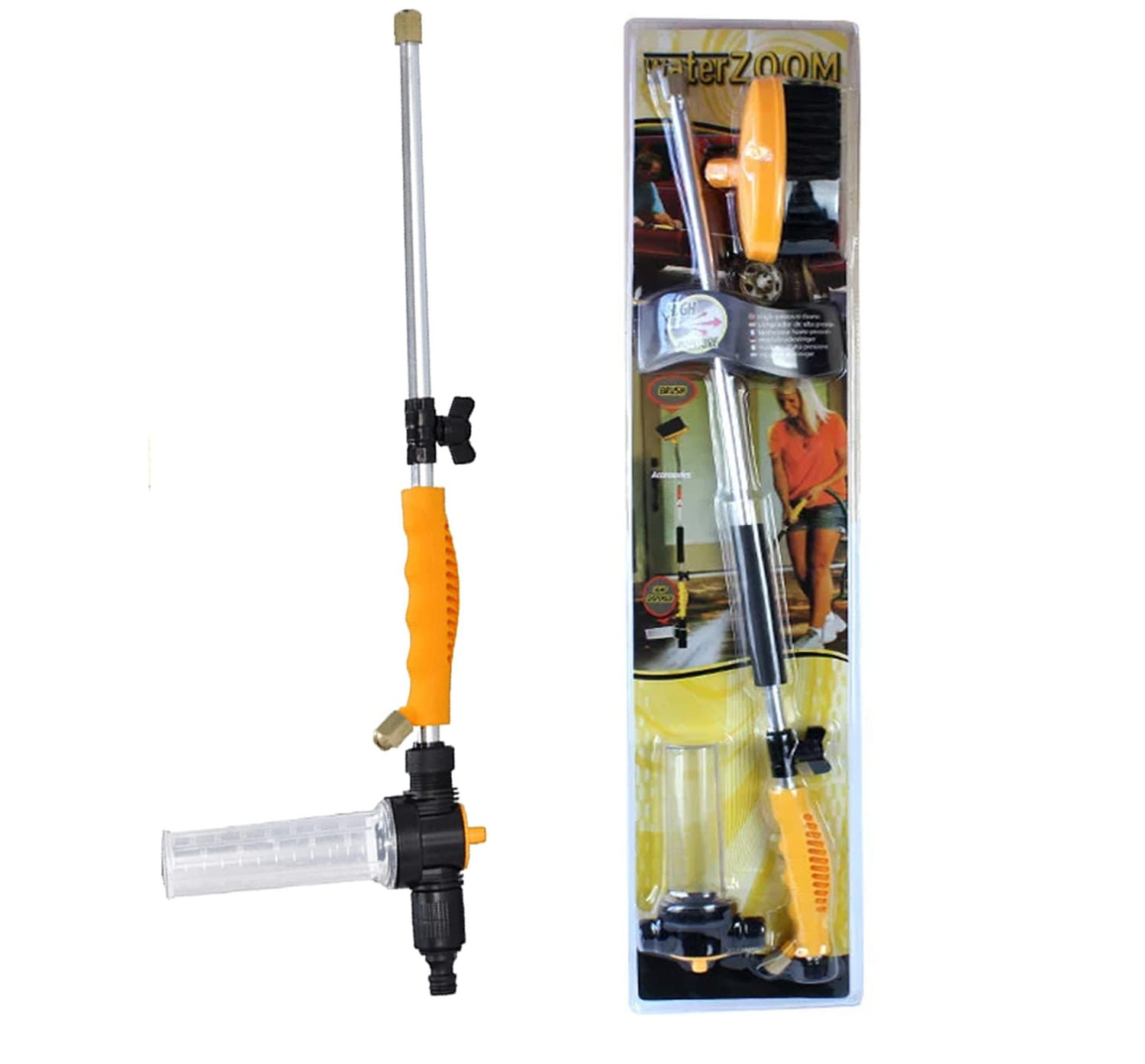 El Wáter Zoom Limpiador Multifuncional de alta presión convierte tu manguera en una Hidro lavadora. El Wáter Zoom Hidro lavadora Multifuncional Limpia como una máquina desde superficies sucias y mohosas hasta los muebles de su patio Asea de forma más rápida y sencilla por su tecnología compresora, podrá girar la boquilla para cambiar la manera en que sale el agua a forma de abanico. Con tan solo regular la válvula de salida podrá controlar la presión de agua que necesite Revolucionaria y poderosa vara a su manguera, para que funcione como un perfecto ayudante que le facilitará el trabajo de limpieza, Remueve moho pegado en muros o paredes, Lavado de ventanales, CARROS, patios, techos y todo aquello que se pueda imaginar. Una fantástica herramienta que le dará un uso extraordinario a su manguera Transformando la fuerza de agua normal en un potente chorro a presión.
