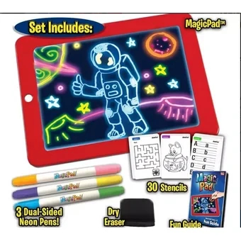 La nueva forma de dibujar y crear para que todo tu arte se ilumine!La pantalla única de Magic Pad es clara, pero una vez que dibujas o escribes, tu arte brillará súper brillante de día o de noche. El secreto son las luces LED de explosión de color con ciencia de pantalla iluminada, por lo que puede esbozarlas, dibujarlas o escribirlas, presiona el botón para que todo brille!Hay 8 efectos de luz diferentes. Luego, límpialo y comienza de nuevo. Magic Pad es perfecto para viajes largos por carretera. Hace que el aprendizaje sea divertido y estimula la creatividad. Con el soporte incorporado hace que sea fácil exhibir tu arte o usarlo como luz de noche.