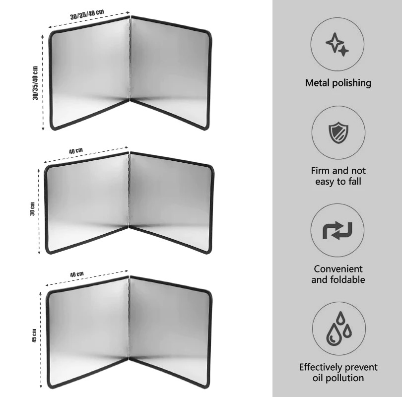 Se pliega hacia abajo, cuando haya terminado de usarlo, simplemente colóquelo en un armario, cajón o despensa, hecho de material de acero inoxidable de alta calidad, se puede plegar en cualquier forma que necesite y es fácil de limpiar. Los bordes negros de goma evitan el raspado manual y es más seguro de usar, la superficie tiene un revestimiento antiadherente duradero que ahorra tiempo en la limpieza y evita que el aceite de cocina salpique en paredes y suelos.